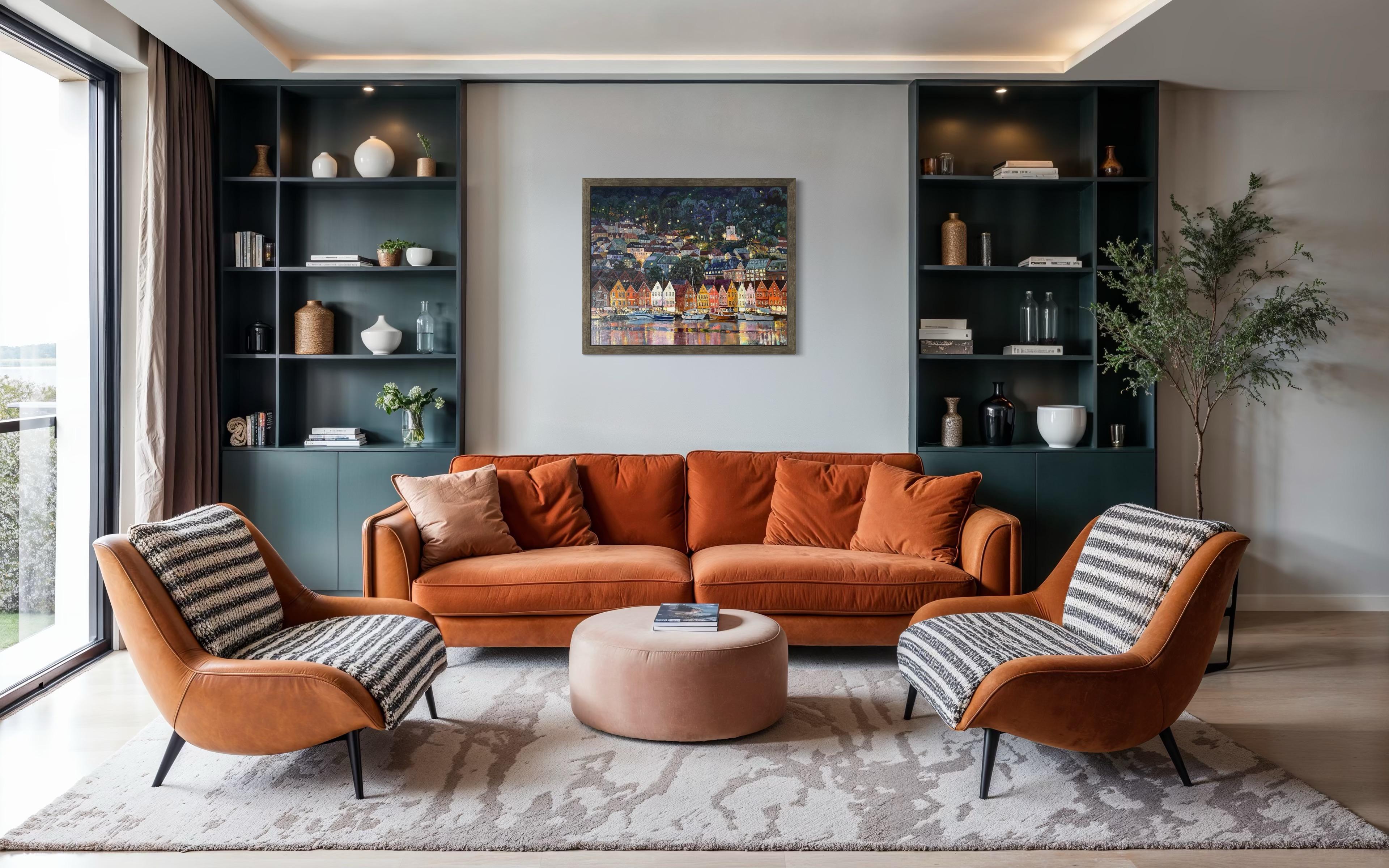 Cette œuvre d'art capture de manière saisissante l'essence pittoresque d'une ville portuaire dynamique. Des maisons aux couleurs riches, peintes dans des rouges et des blancs chauds,...