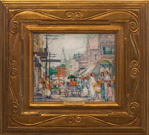 Originaire de Philadelphie, Nancy Ferguson était un membre très apprécié des "Philadelphia Ten". Après avoir obtenu son diplôme à la Philadelphia High School for Girls, elle a entamé une période d'études enrichissante, d'abord à la Philadelphia School of Design for Women sous la direction d'Elliot Daingerfield, puis à la Pennsylvania Academy of the Fine Arts sous la direction de Chase, Breckenridge, Hawthorne, Carles et McCarter. Elle a obtenu un nombre impressionnant de cinq bourses, dont la très convoitée Cresson Traveling Scholarship pour un voyage à l'étranger, décernée par l'Académie en 1909. Alors qu'elle réside en permanence à Philadelphie, elle tombe amoureuse du village pittoresque de Provincetown, dans le Massachusetts, où son ancien professeur, Charles Hawthorne, dirige une école d'été. Pendant la majeure partie de sa vie d'adulte, elle a partagé son temps entre les deux sites. Elle préférait peindre des scènes de rue très animées. Ses scènes de Philadelphie (Rittenhouse Square et Fairmont Park) sont bien connues, tout comme ses nombreuses vues de Provincetown et de ses environs. Les travaux antérieurs de Ferguson sont souvent comparés à ceux de Maurice Prendergast. En fait, le Dr Albert Barnes a acheté l'une de ses oeuvres pour sa Collectional et l'a utilisée comme comparaison avec Prendergast dans son cours d'appréciation de l'art. Aujourd'hui, elle fait partie de la collection permanente de la Fondation Barnes. Ses œuvres ultérieures, du milieu des années 1920 et 1930, adoptent un style plus moderniste. Elles représentent généralement l'architecture serrée, les routes sinueuses et les ports encombrés de Provincetown. En plus d'exposer avec The Philadelphia Ten (1923-27, 1930-38), Ferguson a été invitée à exposer dans de nombreux salons prestigieux, dont la Pennsylvania Academy of Fine Arts, la Corcoran Gallery of Art, le Philadelphia Sketch Club, la National Association of Women Painters and Sculptors, la Woodmere Art Gallery, la Philadelphia School of Design for Women, la National Academy of Design, le Carnegie Institute, l'Art Institute of Chicago et le Salon de Paris, parmi d'autres.