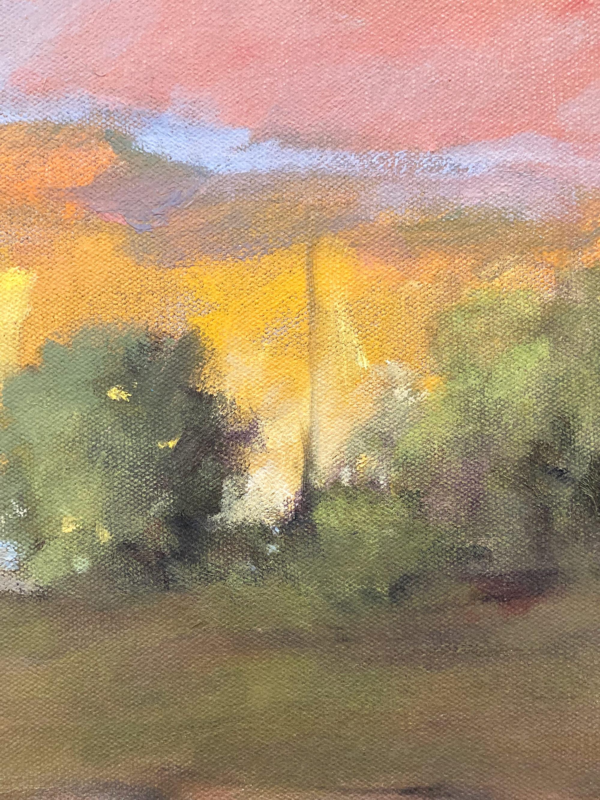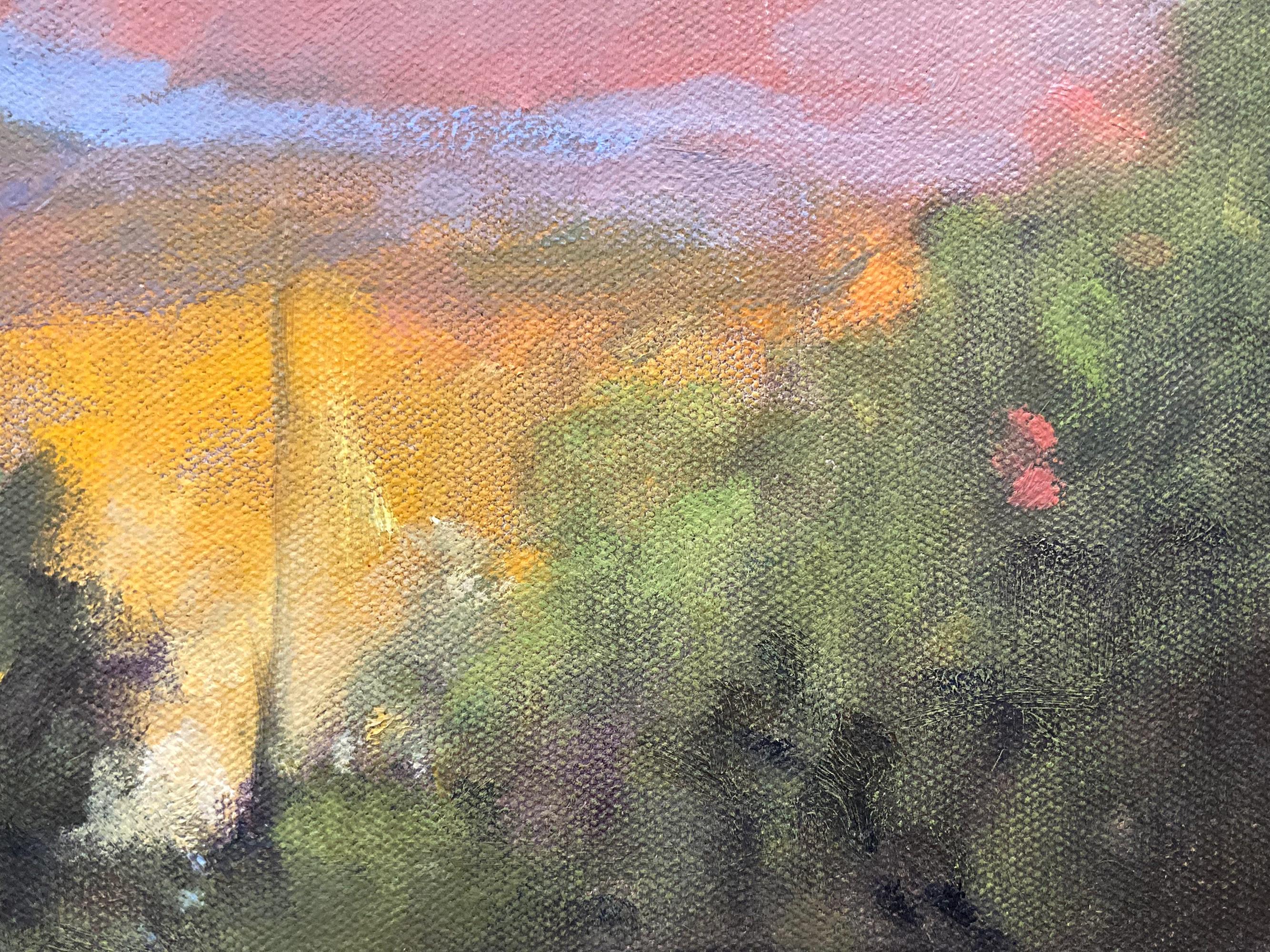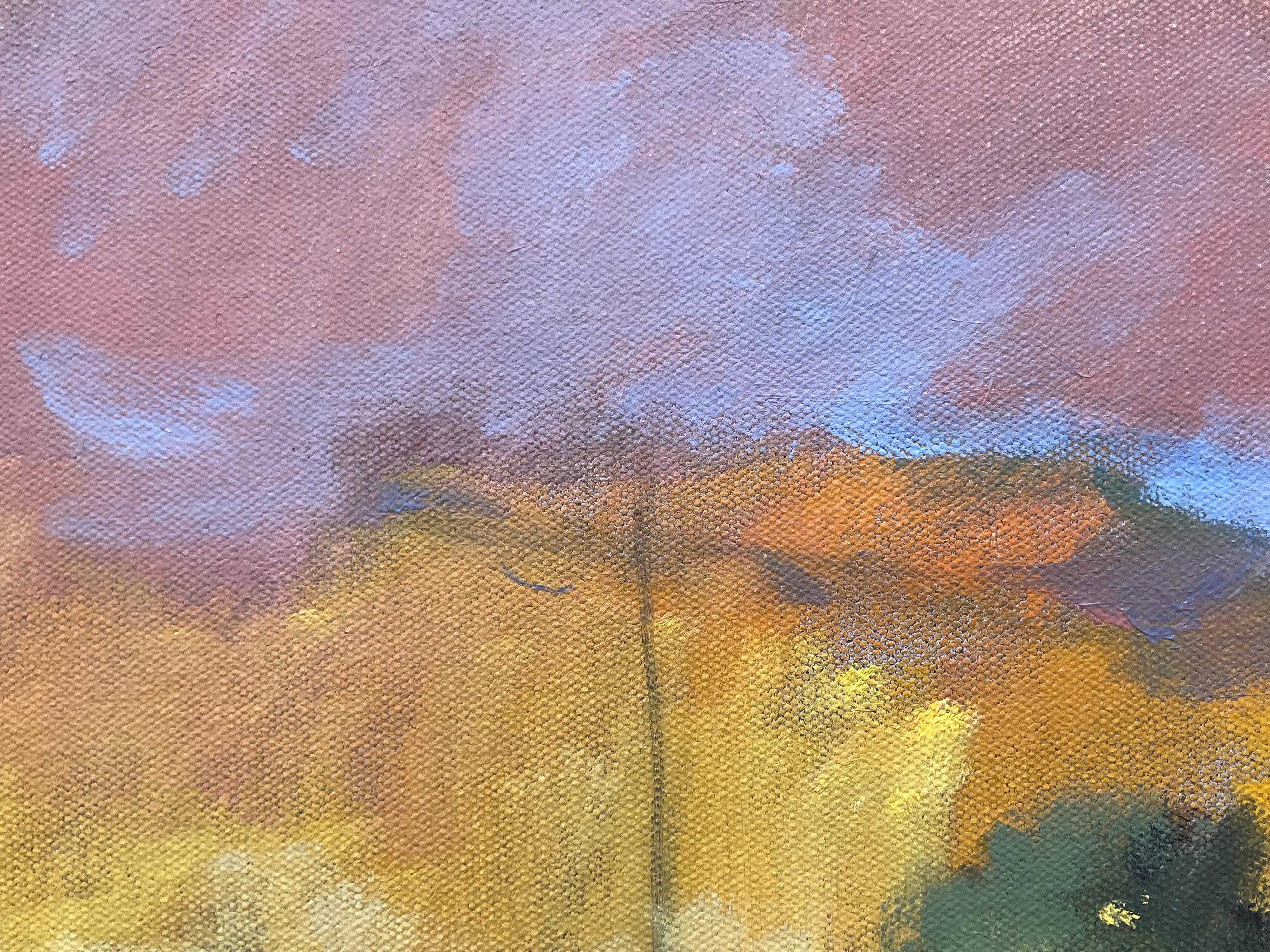 "Les lumières du crépuscule : harmonie et tension dans le paysage". Huile sur carton