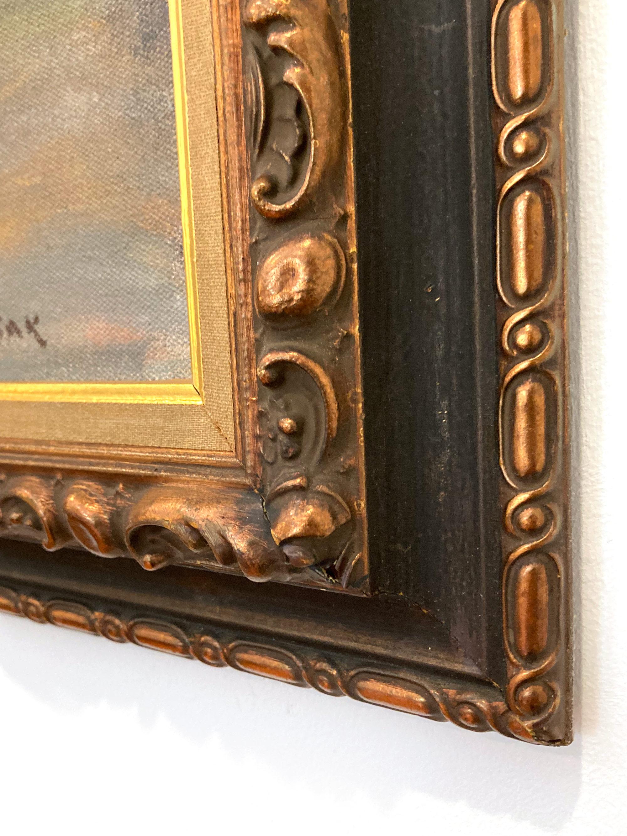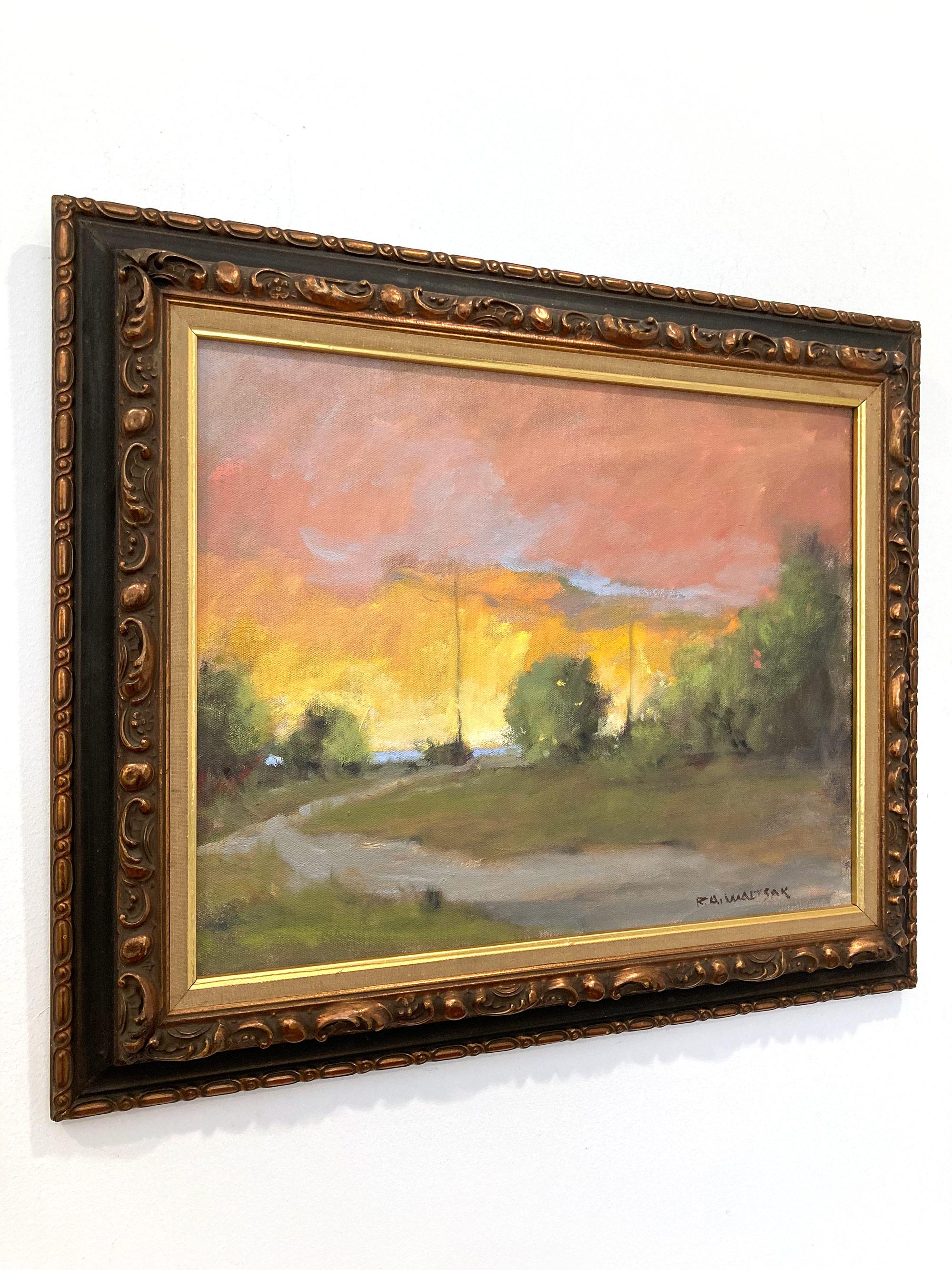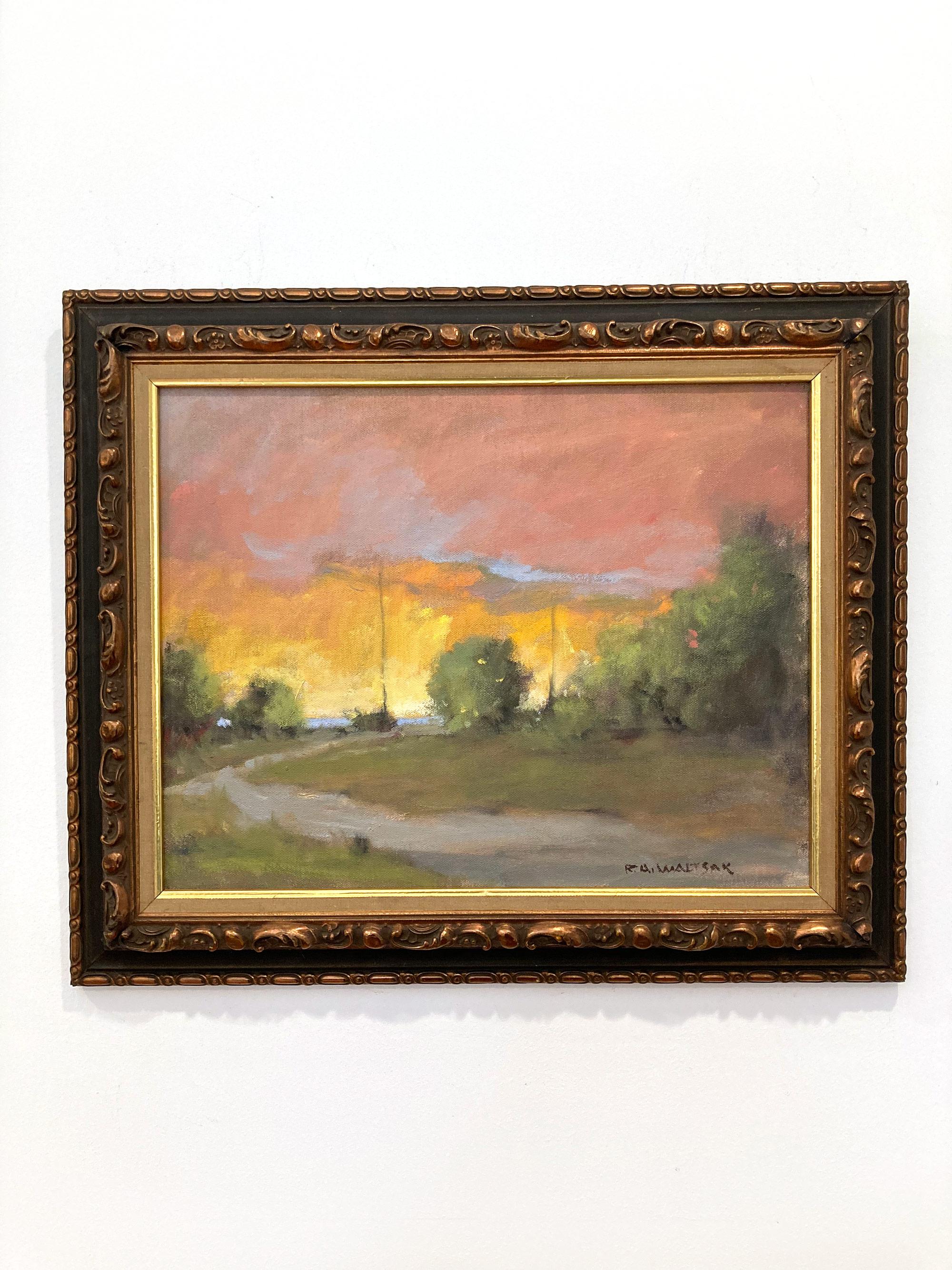 A wonderful impressionist pastoral landscape with beautiful color tones throughout. Waltsak has portrayed this piece in a most intimate, yet energetic way, and has packed much feeling into this vibrant work. It is almost as if we are there on that warm day, bringing a beautiful feeling of nostalgia setting off down the glowing path to the water, where sails await. The sunset is stunning sight, Robert Waltsak is known for capturing the beauty and simplicity of our times, depicting everyday life; the flower market in the morning, New York City views, villages, farms, and intimate moments shared between friends. Waltsak engages his audience with the quick use of brushwork and great attention to picking up the energy passionately of his subjects. Many of his paintings are depicted in recognizable historical settings and this piece is an excellent example of this as he captures warm sky with lush greenery making a breathtaking sight. This painting is oil on canvas and it is signed by the artist lower right, it comes housed in an ornate wood carved frame with gold