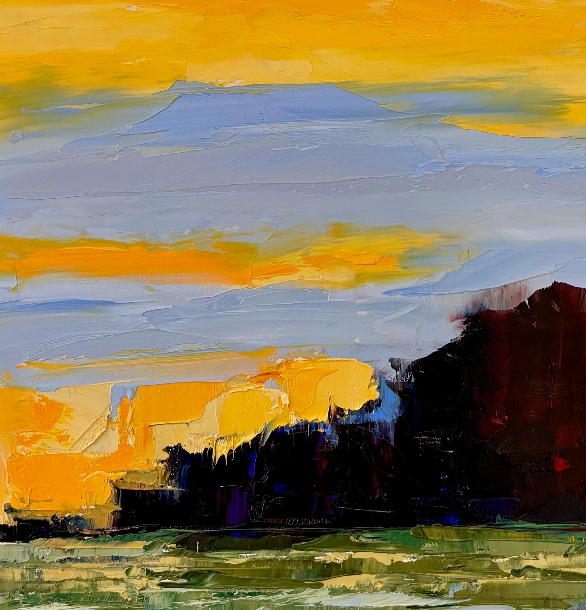 "Evening's Glory" (2025) est une magnifique peinture à l'huile originale en empâtement, créée sur panneau de lin par l'artiste américaine Sandra Pratt, qui représente une chaîne de montagnes au coucher du soleil, capturée dans un style expressionniste.