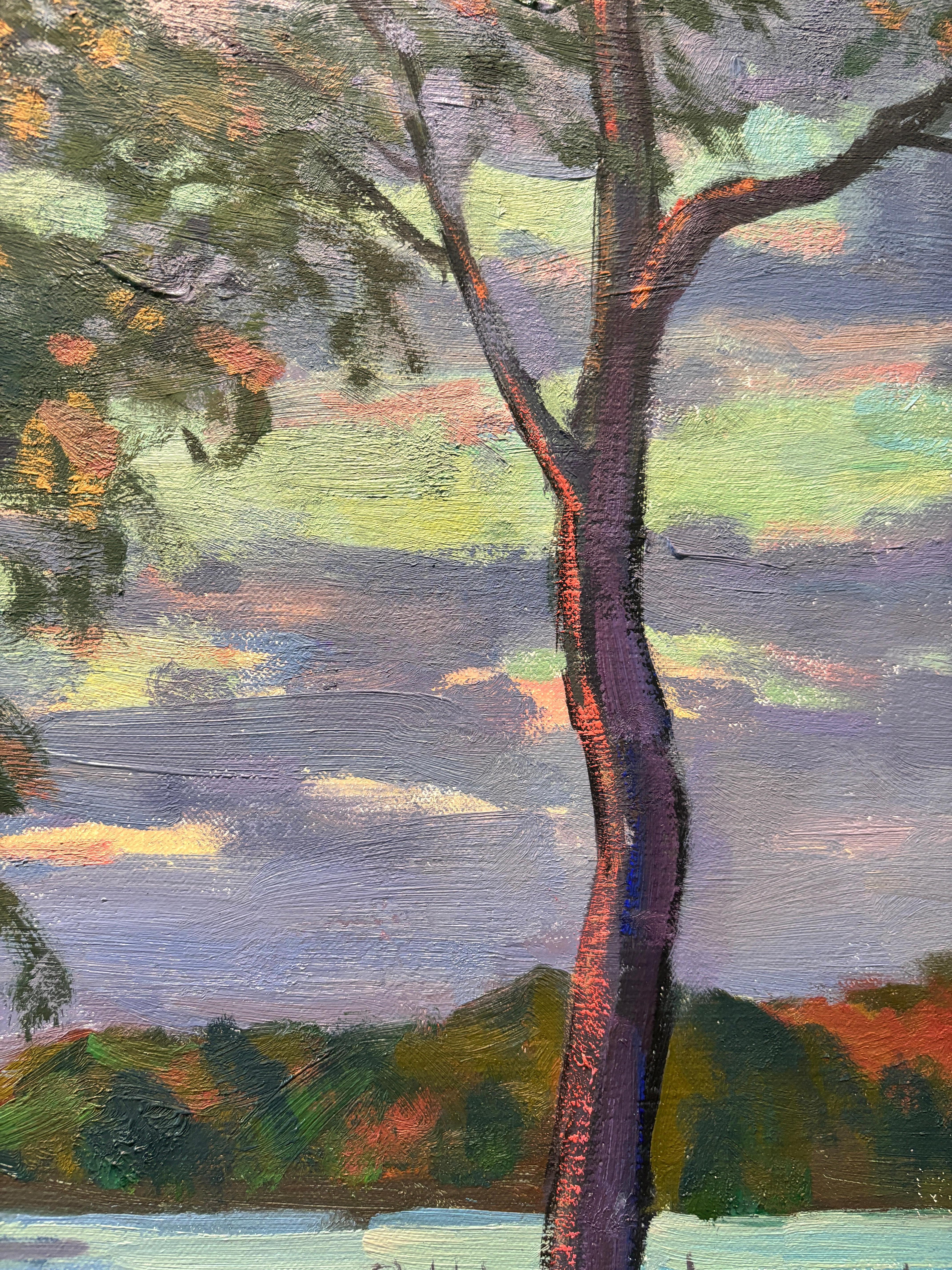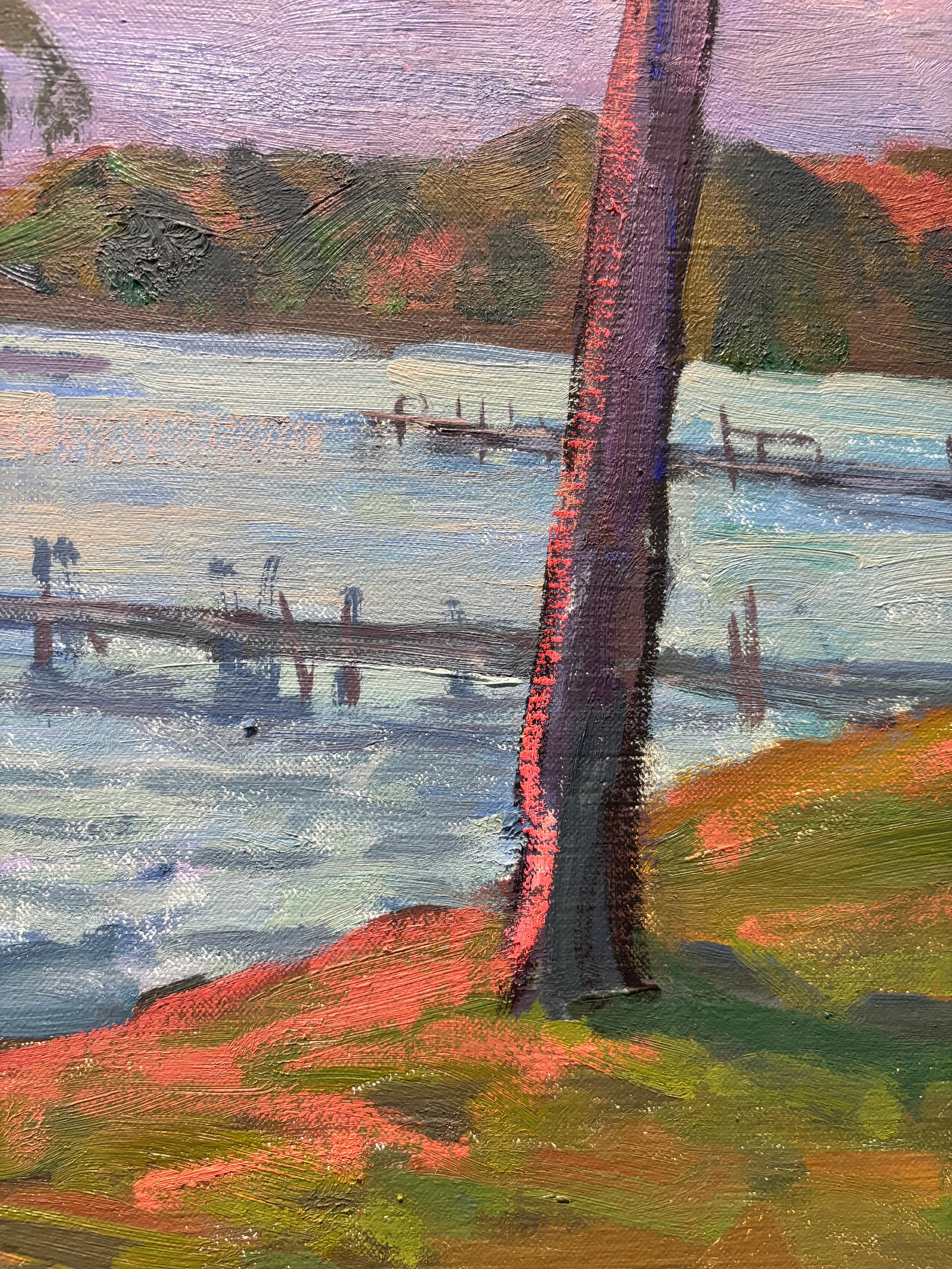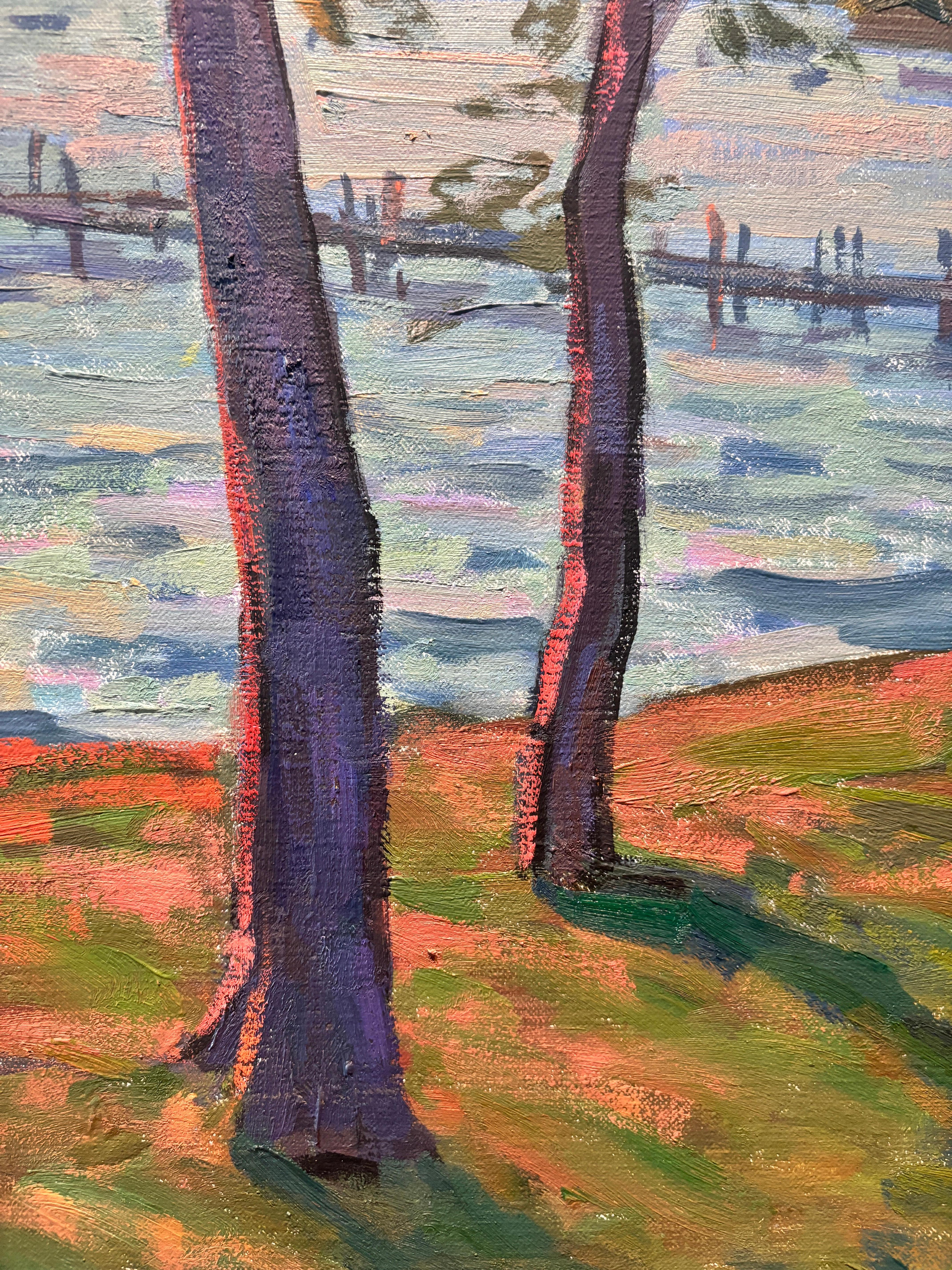 Peinture à l'huile représentant des arbres surplombant un port. Les arbres d'un parc herbeux et ombragé encadrent les jetées et les bateaux en attente. Au loin, des voiliers flottent...