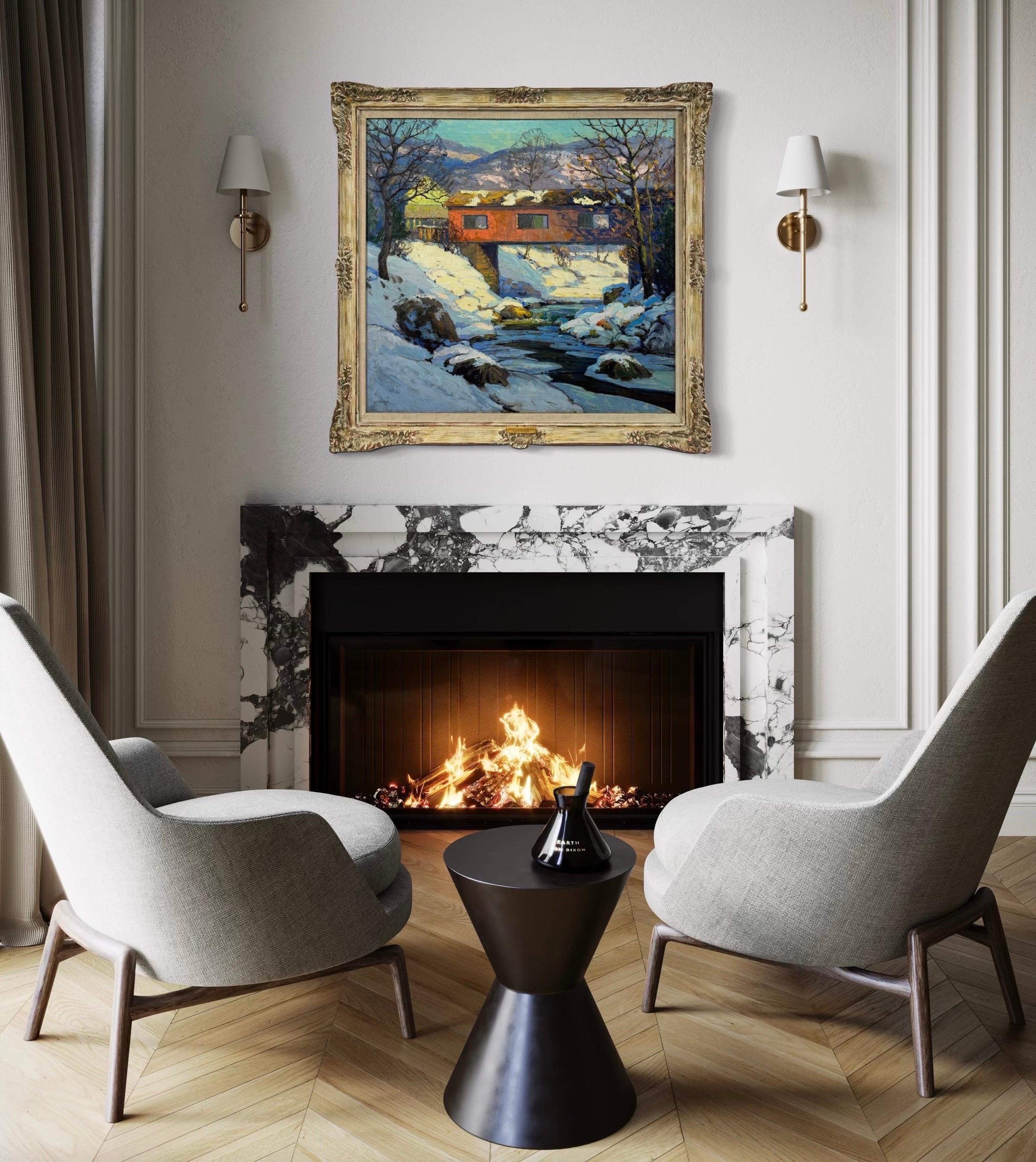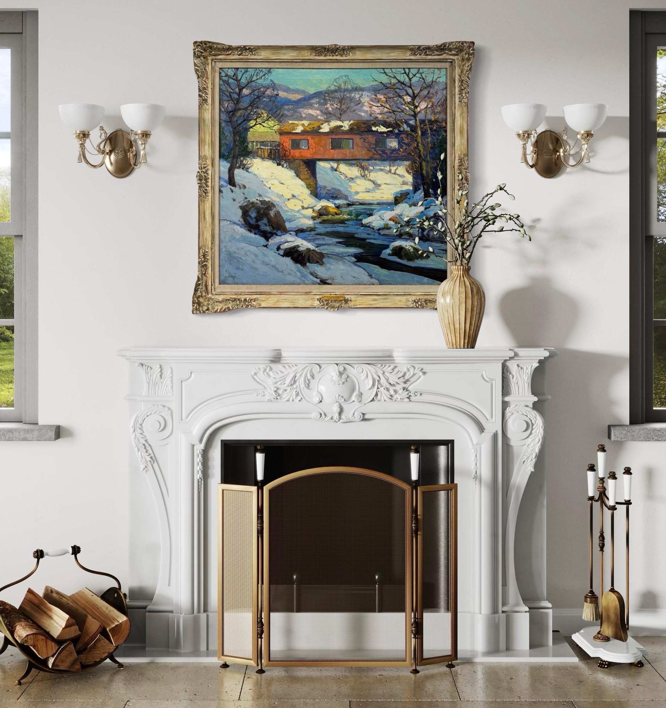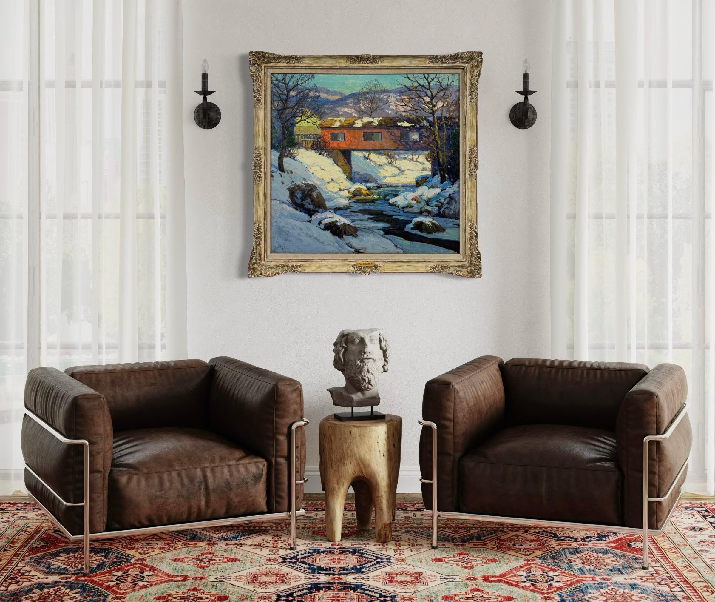 Connu pour ses paysages évocateurs recouverts de neige, Koeniger donne vie à ce sujet grâce à son coup de pinceau audacieux et assuré et à son sens aigu de la lumière naturelle. La composition s'articule autour d'un pont couvert rouge rustique, qui enjambe un ruisseau légèrement sinueux, flanqué de rives chargées de neige et d'arbres d'hiver dénudés. Le pont, rendu dans des tons chauds et terreux, contraste lumineusement avec les bleus et les blancs froids de la neige environnante, créant un point focal vivant au milieu d'un décor hivernal serein.