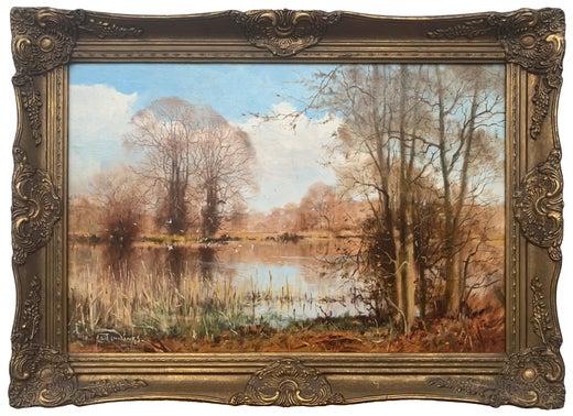 Une immense huile sur toile anglaise de Walter Robin Jennings représentant un paysage fluvial atmosphérique de fin d'hiver.