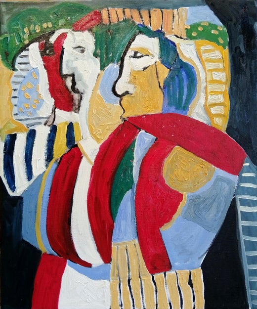 huile expressionniste jaune clair et bleue sur toile de lin « Two Figures »
