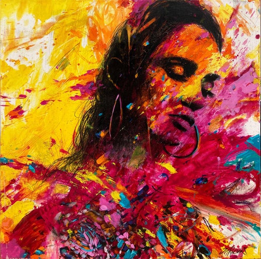 Les portraits de JM Robert commencent par un fond lumineux et audacieux réalisé à la bombe de peinture. JM a commencé sa carrière en tant qu'artiste graffeur, peignant ses portraits sur les murs de Paris, de France et de certaines régions d'Europe. Aujourd'hui, il est capable de faire le lien entre les Beaux-Arts et le Street Art sur ses toiles dans une danse élégante qui consume son public de couleurs et de beauté sans effort. Une fois le portrait dessiné à la main, son a.muse prend vie, semblant provenir d'un monde alternatif, un monde où les personnages sont des sculptures faites à partir de graffitis. L'éclat de la peinture en aérosol est atténué par l'encre noire pour créer une œuvre vraiment exceptionnelle. Ses peintures à main levée enchantent le public du monde entier, captivant parfaitement les émotions de chacun, racontant une histoire que nous ne pouvons qu'imaginer.