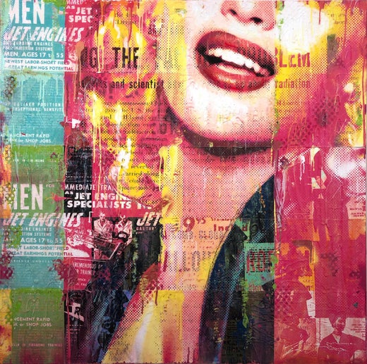 Cette pièce représente un portrait d'un mannequin Pin-up des années 1950, composé d'un collage coloré. Jon Davenport explore le processus de déconstruction de l'imagerie emblématique du passé et du présent. Davenport commence par des photos du sol de son studio taché de peinture et des collages d'articles/publicités tirés d'une série de magazines anciens collectés au fil des ans, ainsi que tout autre élément intéressant capturé au cours de ses voyages. Il transfère ensuite les images sur un panneau, en les superposant à l'aide d'un médium gélifié, ainsi que de traits, d'éclaboussures, de gouttes et d'éclaboussures de peinture. Une fois qu'il est sec, une autre couche de médium gélifié est versée pour lui donner un effet de fusion. Après séchage, une autre couche de peinture est ajoutée pour embellir quelques zones et accentuer ou estomper certains aspects. Enfin, il ajoute une couche de polyuréthane pour protéger et faire ressortir les couleurs. Cette œuvre unique est exécutée sur un panneau de bois et est livrée prête à être exposée avec un fil de suspension au verso, signé par l'artiste en bas à droite.