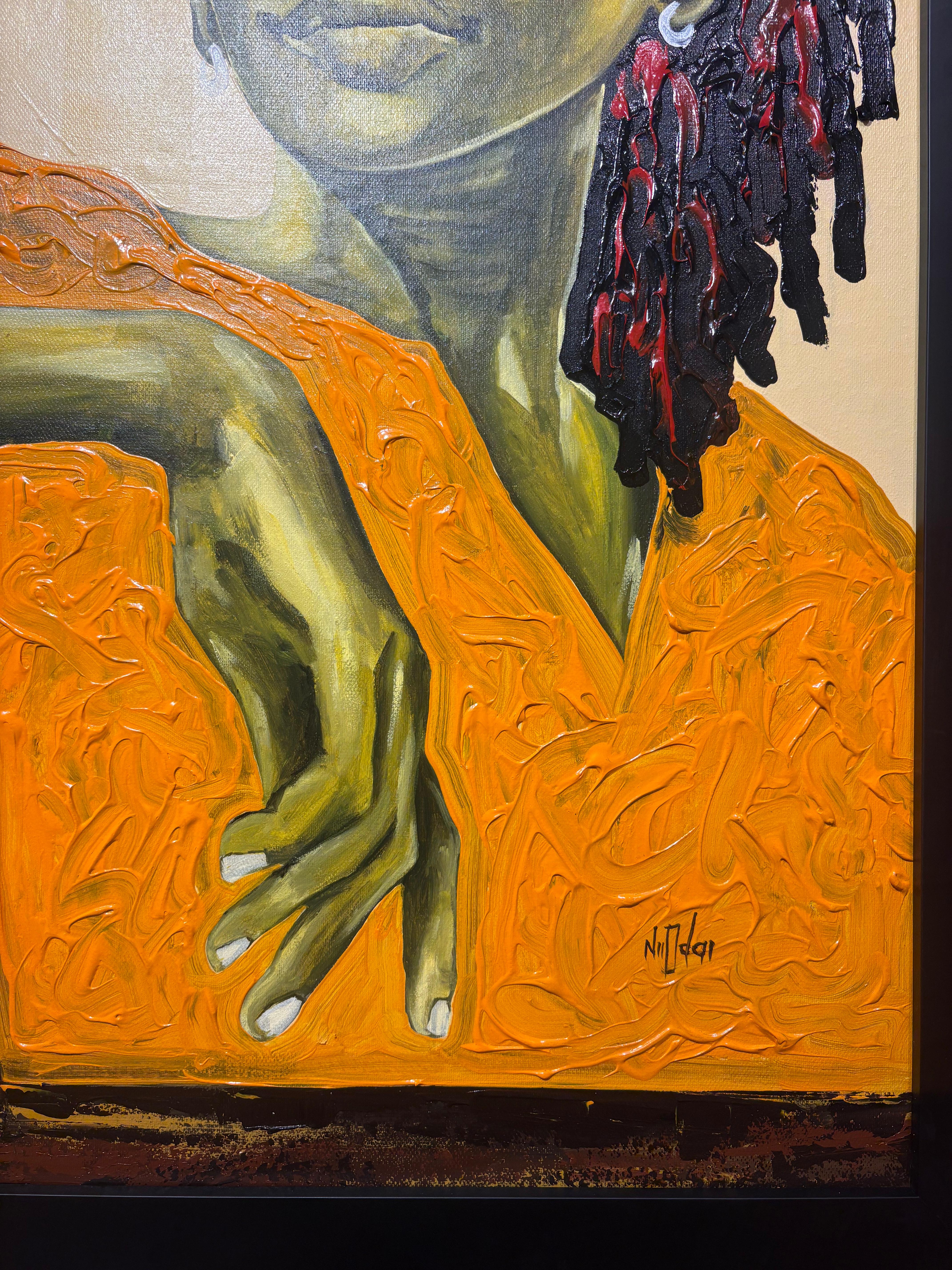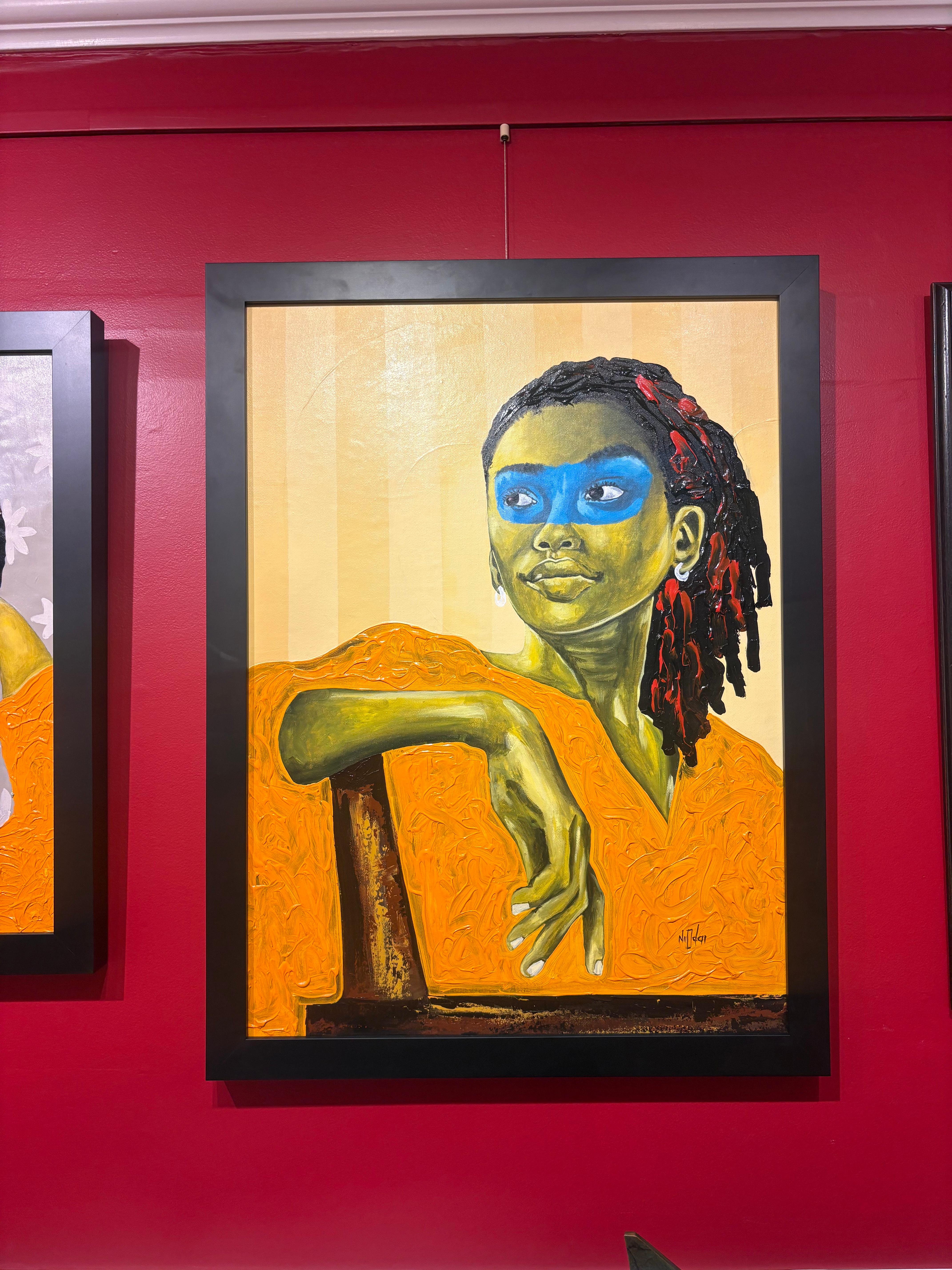 "Sitting Pretty" est une peinture qui capture l'essence de la beauté africaine d'une manière saisissante. L'œuvre représente une jeune femme assise sur une chaise, vêtue d'une robe colorée et vibrante. La posture de la femme dégage une impression de confiance et d'assurance, et son visage est serein et calme.
