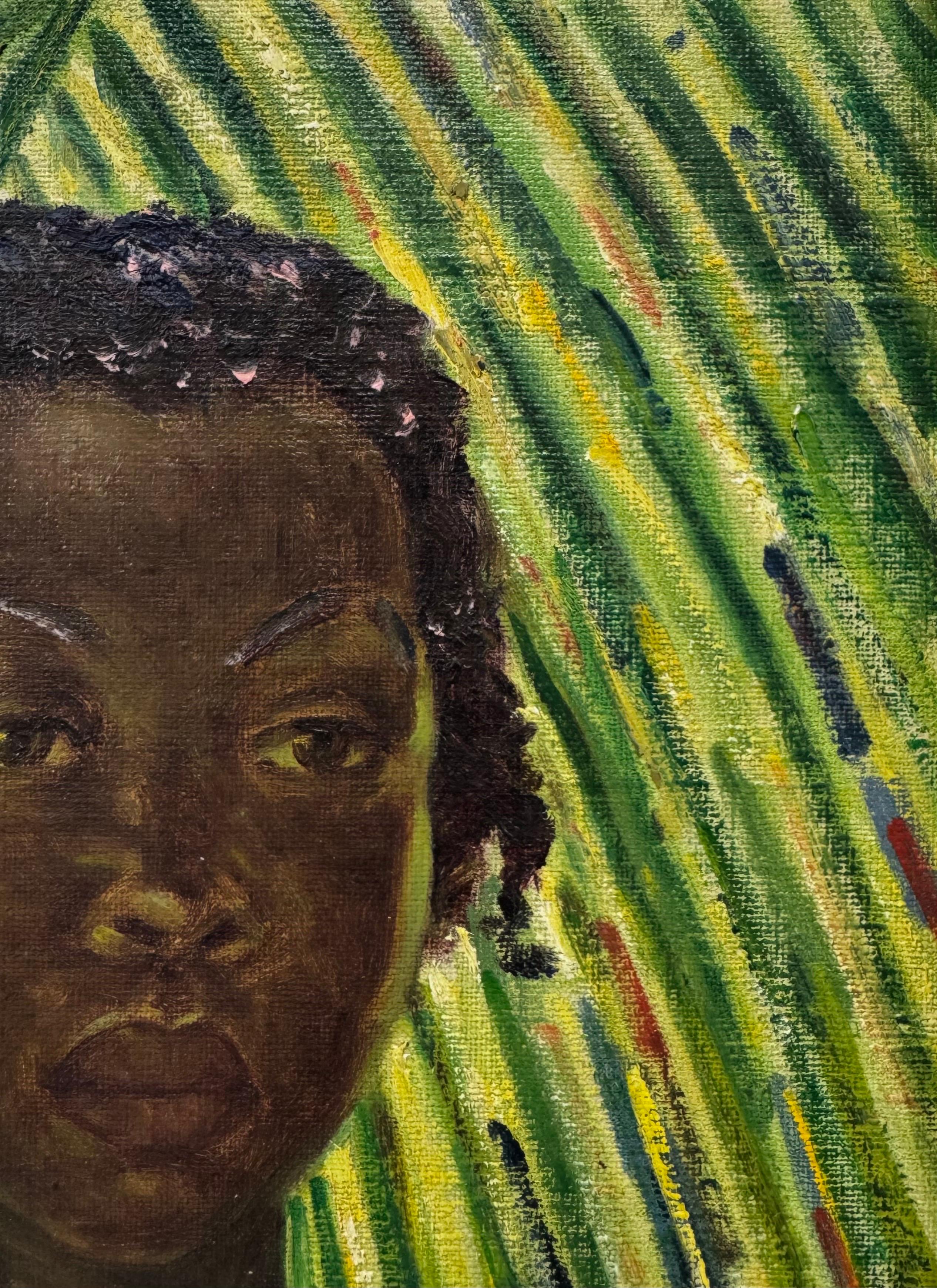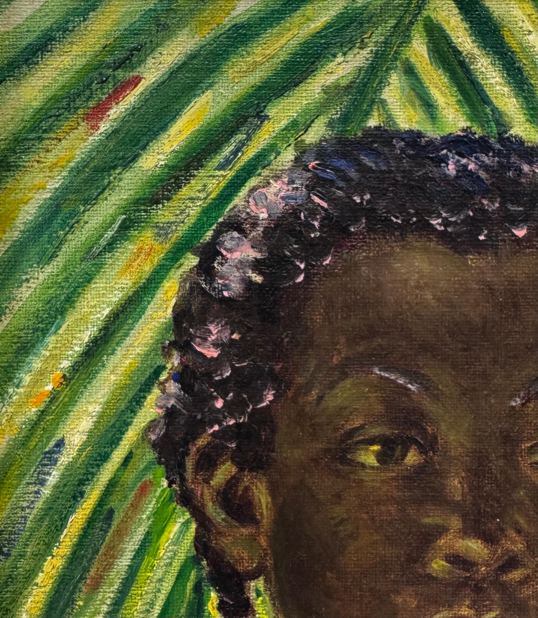 Cette composition souligne l'équilibre et l'expression sereine du personnage, avec un soupçon de contemplation tranquille. L'utilisation de la couleur et du pinceau est particulièrement frappante. Le teint sombre de la jeune fille est rendu par des tons riches et profonds qui contrastent magnifiquement avec les verts et les jaunes vifs des feuilles de palmier derrière elle. Ses cheveux courts et bouclés sont peints avec des traits expressifs et texturés, rehaussés de touches de rose et de lumière. Elle porte un vêtement rayé dans des tons chauds et terreux, avec des nuances de rose, de jaune et de brun, qui s'harmonisent avec l'arrière-plan tout en encadrant subtilement son visage.