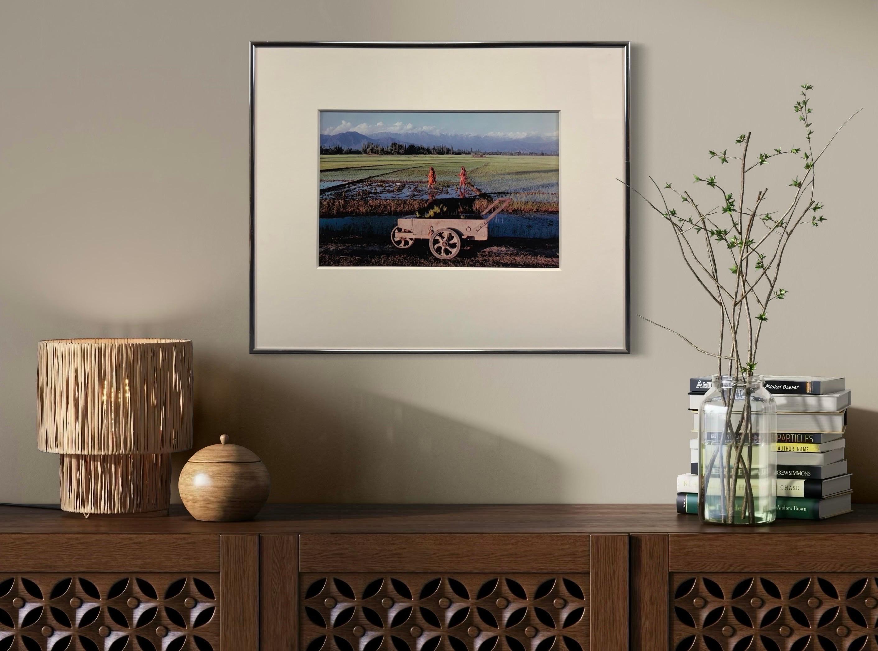 Au premier plan, une charrette en bois munie de grandes roues métalliques, vraisemblablement utilisée pour transporter des semis, repose au bord du champ. La perspective met l'accent sur le travail et les outils agricoles qui sont au cœur de la vie rurale dans cette région. En arrière-plan, la beauté sereine du Cachemire est mise en valeur par son paysage emblématique : des champs verts plats, des arbres épars et le majestueux Himalaya sous un ciel partiellement nuageux.