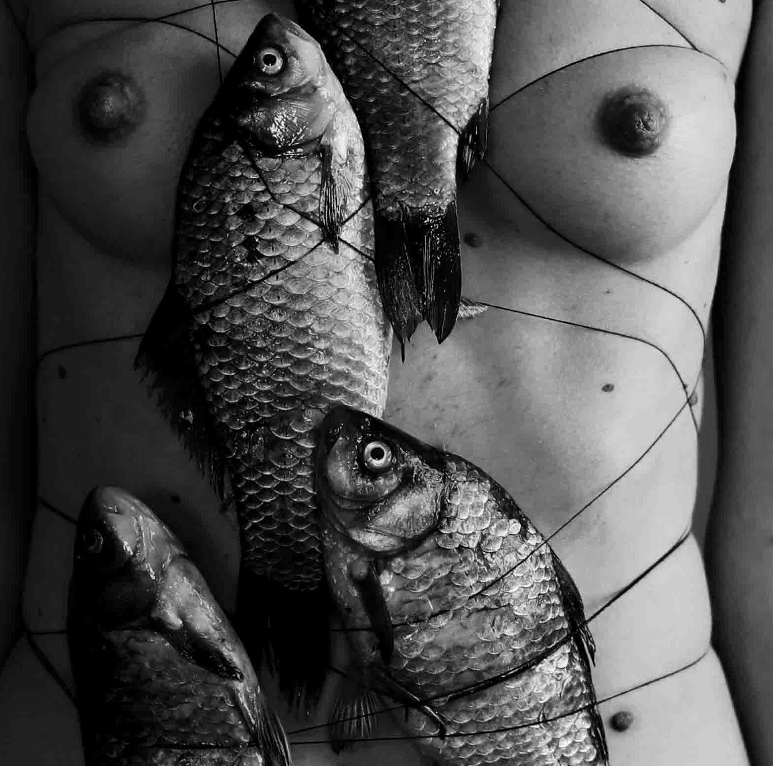 Photographie sous-marine en noir et blanc d'une femme aux seins nus prise dans un filet de pêche.