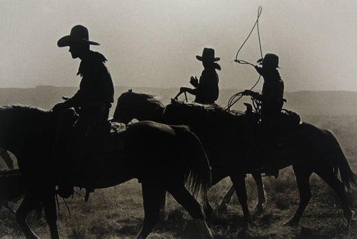 Le photographe de l'Ouest Bank Langmore a beaucoup voyagé avec les convois de bétail, photographiant les cow-boys lors de leur voyage vers le nord. Ses images ont été publiées par Morrow dans le célèbre livre The Cowboy en 1975.