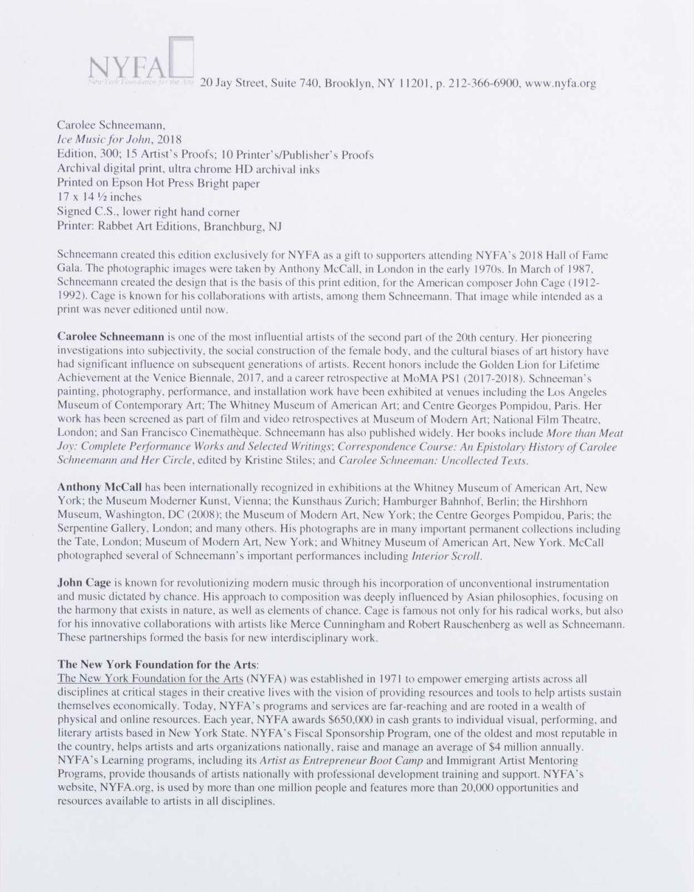 Carolee Schneemann (américaine, 1939-2019), " Ice Music for John ", impression numérique d'archives avec des encres d'archives Ultra Chrome HD sur papier Epson Hot Press Bright, imprimée par Rabbet Art Editions, Branchburg, NJ, signée " C.S. " en bas à droite, et édition numérotée " 68/300 " en bas à gauche, non encadrée dans le folio original de la NYFA. Image : 13.5" H x 11" L ; feuille : 17" H x 14,5" L. Provenance : De la Collectional de Laura et Lewis Kruger.