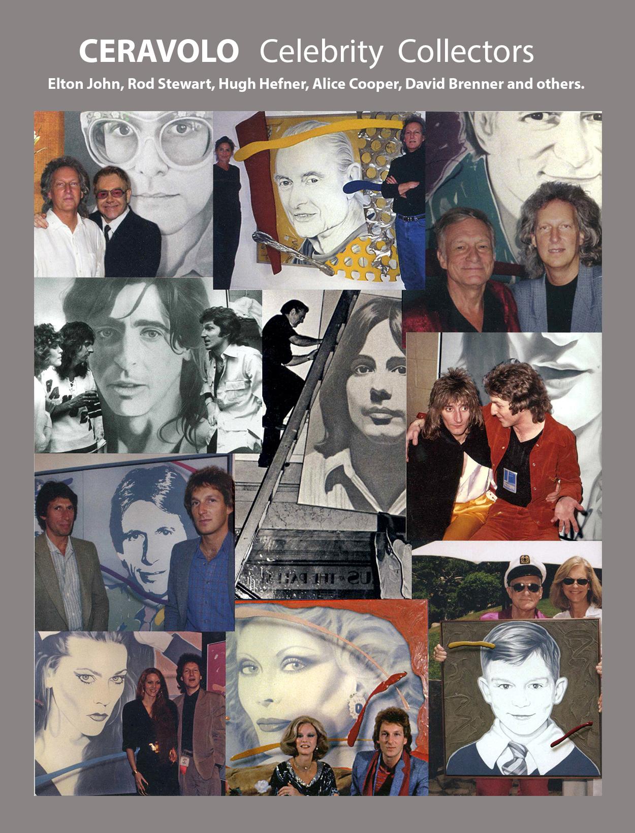 Nous avons inclus dans cette liste une image de Ceravolo avec certains de ses célèbres collectionneurs. Ses peintures figurent dans de nombreuses collections privées et d'entreprises influentes, parmi lesquelles : ELTON JOHN, ROD STEWART, PETE DAVIDSON, GRANT CARDONE, HUGH M. HEFNER, DAVID BRENNER, MONIQUE VAN VOOREN, WARNER BROS, RCA RECORDS et SCHENLEY INDUSTRIES, pour n'en citer que quelques-uns.
