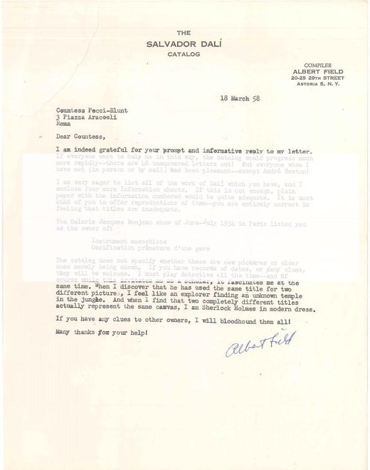 L.T.S. (Lettre dactylographiée signée) Typewritten Letter Signed by Albert Field, on letter headed paper with double heading, central "The Salvador Dalì Catalog", top right "Compiler Albert Field, 20-25 29th Street, Astoria 5, N.Y." addressed to the Countess Anna Laetitia Pecci -Blunt. Daté du 8 mars 1958. Une page (27,8 x 21,5 cm). En anglais. Parfait état avec les plis habituels du papier. Avec quelques notes au crayon et à l'encre bleue de la comtesse.