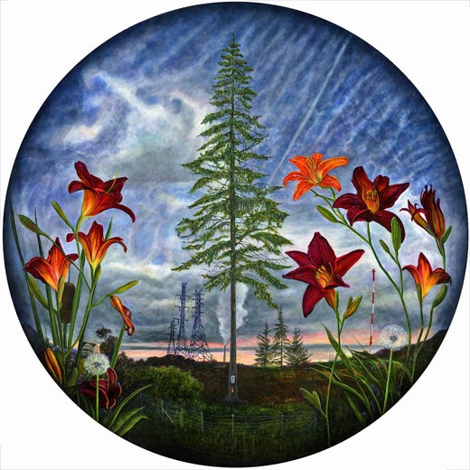 L'appréciation de la peinture de paysage a toujours été intemporelle, et parfois presque viscérale ou spirituelle. Cependant, le paysage quotidien contemporain semble dépourvu de certaines de ces qualités antérieures - c'est ce que je vois et traverse quotidiennement. Dans cet environnement, je cherche les possibilités critiques, les vignettes que je peux facilement appliquer, mettre en scène et manipuler comme un journal intime. Mon travail consiste en des peintures de paysages à petite échelle et très détaillées. Ils sont inspirés par le confort, l'inquiétude et la beauté que l'on trouve dans l'existence banale de la banlieue de Chicago. Je combine la nature, les objets décoratifs, les structures municipales et les artefacts personnels pour faire allusion à la vie actuelle et aux implications futures dans l'orchestration de ces éléments. Chaque œuvre de la série est le portrait d'une recherche de repères au cours d'un voyage, une tentative d'apprendre à partir de ce qui est palpable et d'apprécier l'intangible. Les peintures sont destinées à suggérer la vérité dans le moment non idéalisé - la vérité réelle n'existe que sur les bords de ma toile, hors de la scène, et dans l'expérience du spectateur. Dessiner les objets de ces tableaux, c'est comme positionner les personnages sur la scène d'une pièce de théâtre, chacun ajoutant à la dramatisation. Par exemple, le "rôle" du ciel incarne une dualité d'espoir expansif et d'anticipation lumineuse ; la fumée est le symbole de l'inconnu, tandis que les châteaux d'eau dénotent des résultats romantiques conjurés, tandis que les ombres attirent l'impraticable. Ils incarnent le bruit de fond et le bruit visuel d'une anxiété dans la consolation de la vie actuelle.