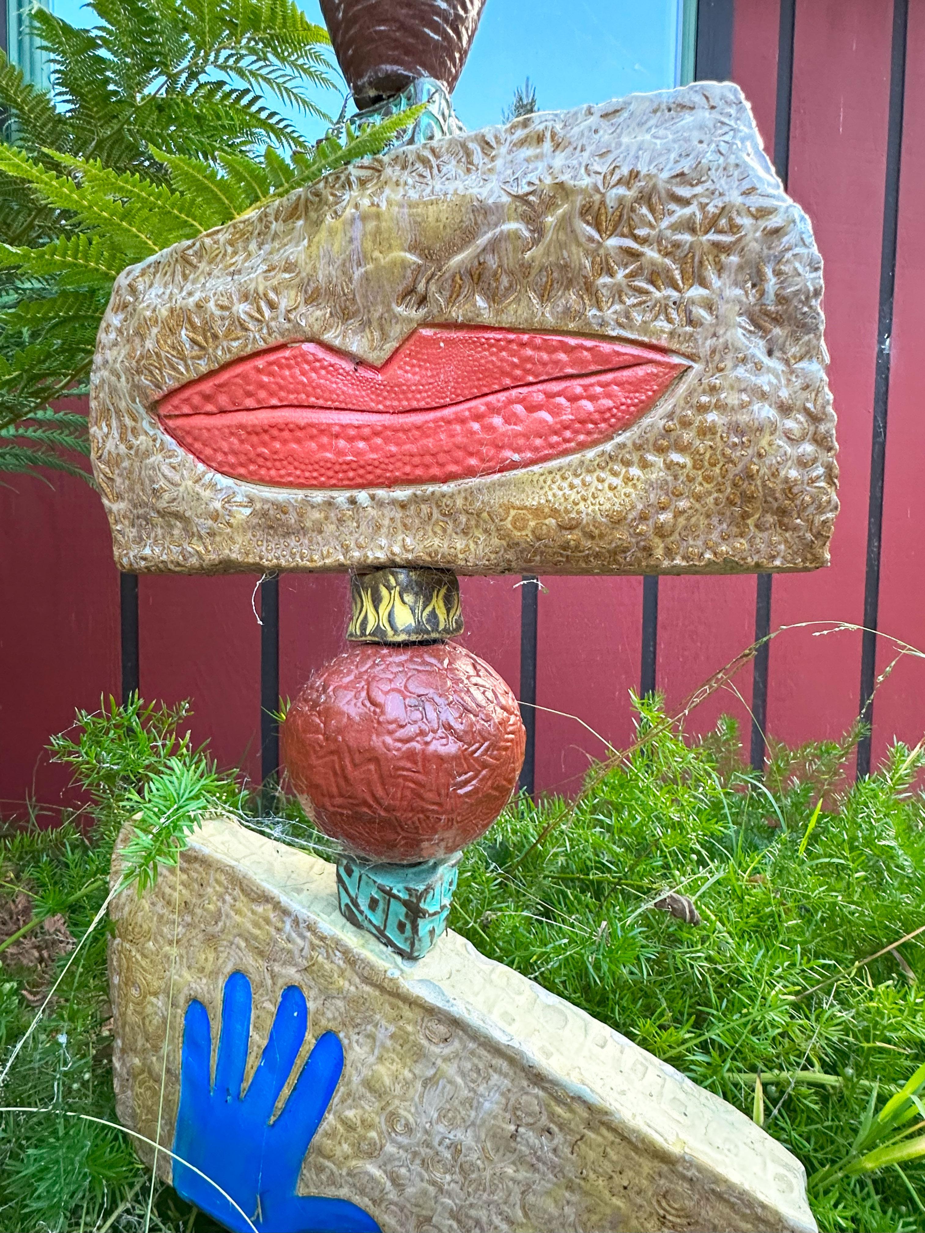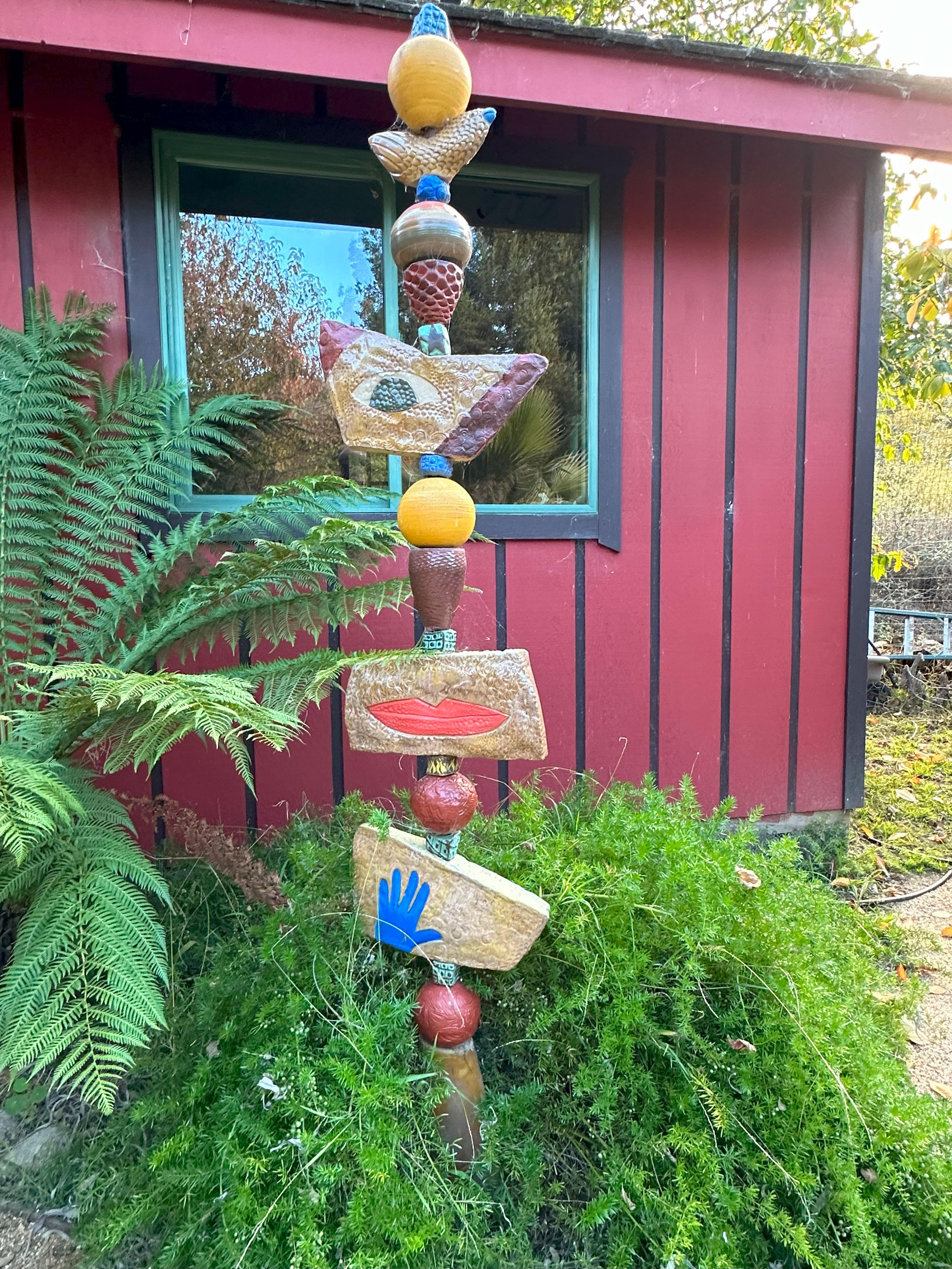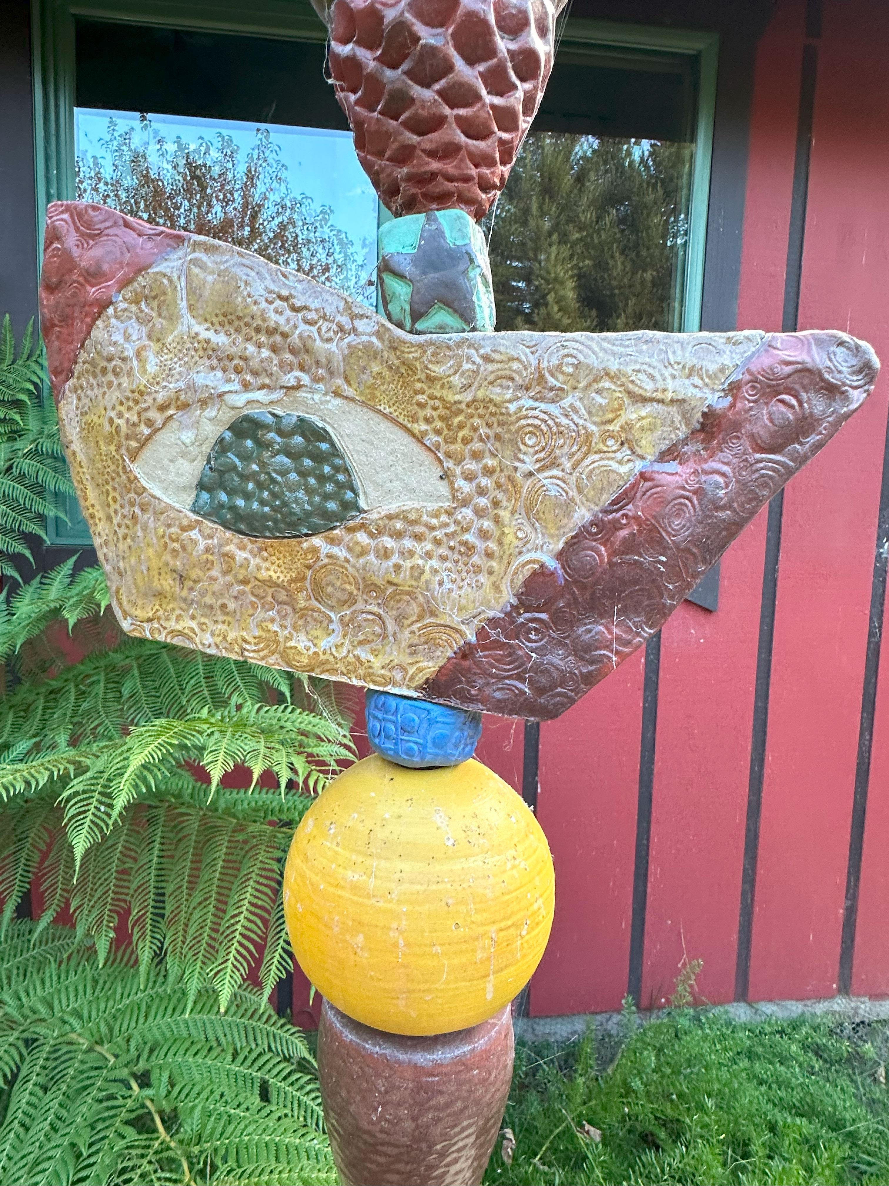 "Mon flux naturel avec l'argile découle de ma première passion artistique ; la poterie dans les années 1960 - 70 à Venice Beach, en Californie. Une carrière de 40 ans en Diptych Fine Arts a fait place l'année dernière à ma passion première : les créations en argile. Cette fois, il s'agit de concevoir des totems en céramique empilés sur des poteaux. Les Garden Totems sont des constructions en argile vernissée, chaque partie sculptée soutenant l'ensemble, créant ainsi une sculpture unique. Chaque totem est une expression unique basée sur mon inspiration du moment, mais le fil de mon style personnel peut être vu dans chacun d'eux. Certaines conceptions de totems commencent par un concept esquissé. - Cependant, j'aime être dans l'instant et me laisser aller à la création spontanée. Faire une partie, puis une autre, sur la base de la première : c'est-à-dire qu'une partie renvoie et donne naissance à une autre jusqu'à ce qu'elle soit complète. Cette spontanéité me permet de rester dans l'instant et de trouver de nouvelles inspirations. Les Garden Totems sont là pour revigorer le jardin ou l'espace intérieur avec un décor ludique et une joie de vivre.