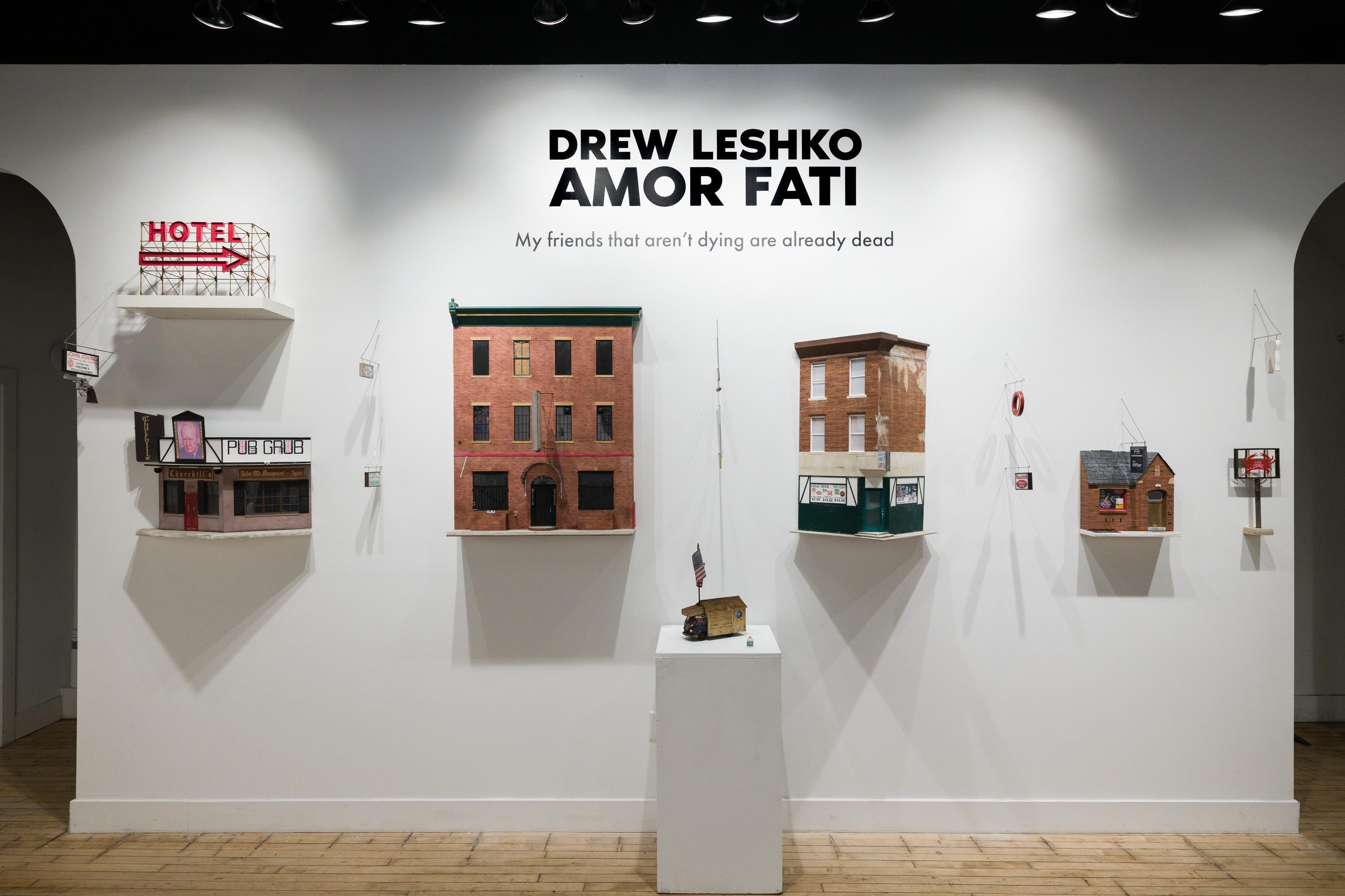 Drew Leshko est un artiste basé à Philadelphie, en Pennsylvanie. En sculptant, découpant et superposant des variétés de papier et de bois, Leshko crée des études documentaires de l'architecture de son quartier dans le but de créer une archive tridimensionnelle de bâtiments qui sont dans des périodes de transition. L'œuvre examine la gentrification et l'histoire, la manière dont la pertinence historique est déterminée et, surtout, ce qui mérite d'être préservé. À partir d'observations et de photographies, l'artiste recrée minutieusement les façades des bâtiments de son quartier à l'échelle 1:12. L'échelle est familière à certains spectateurs comme étant celle d'une maison de poupée standard ; le traitement des bâtiments est très différent. Dans les moindres détails de son oeuvre, il utilise des détritus urbains tels que des bennes à ordures et des palettes, qui commentent les mêmes idées sur ce qui mérite d'être préservé. Mettant en avant des solutions rapides et simples, les œuvres de Leshko invitent le spectateur à se faire sa propre idée du pourquoi et du quand de ces changements. Les accumulations de détails et de minuties généralement négligées, comme les dépôts de pluie acide et la rouille, deviennent de magnifiques ornements.