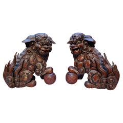 Paire de chiens foo chinois en pierre sculptée. Très belle taille substantielle. Chacun d'eux a une balle mobile dans la bouche. 6,5" x 4" de large 9" de haut. Ajoutez un style asiat...