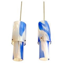 Paire d'appliques murales italiennes produites dans les années 1950, caractérisées par un design linéaire minimaliste. Chaque lampe comporte un diffuseur cylindrique en verre opalin ...