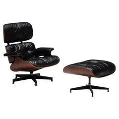 L'un des designs les plus emblématiques de la période du milieu du siècle, la chaise longue Eames 670 avec l'ottoman 671 . En cuir noir souple très recherché et rehaussé d'un riche c...