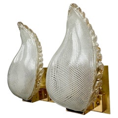 Ensemble de deux appliques en verre de Murano en forme de coquille datant du milieu du siècle dernier, attribuées à Barovier&Toso. Cadre en métal doré et accessoires en laiton. Ampou...