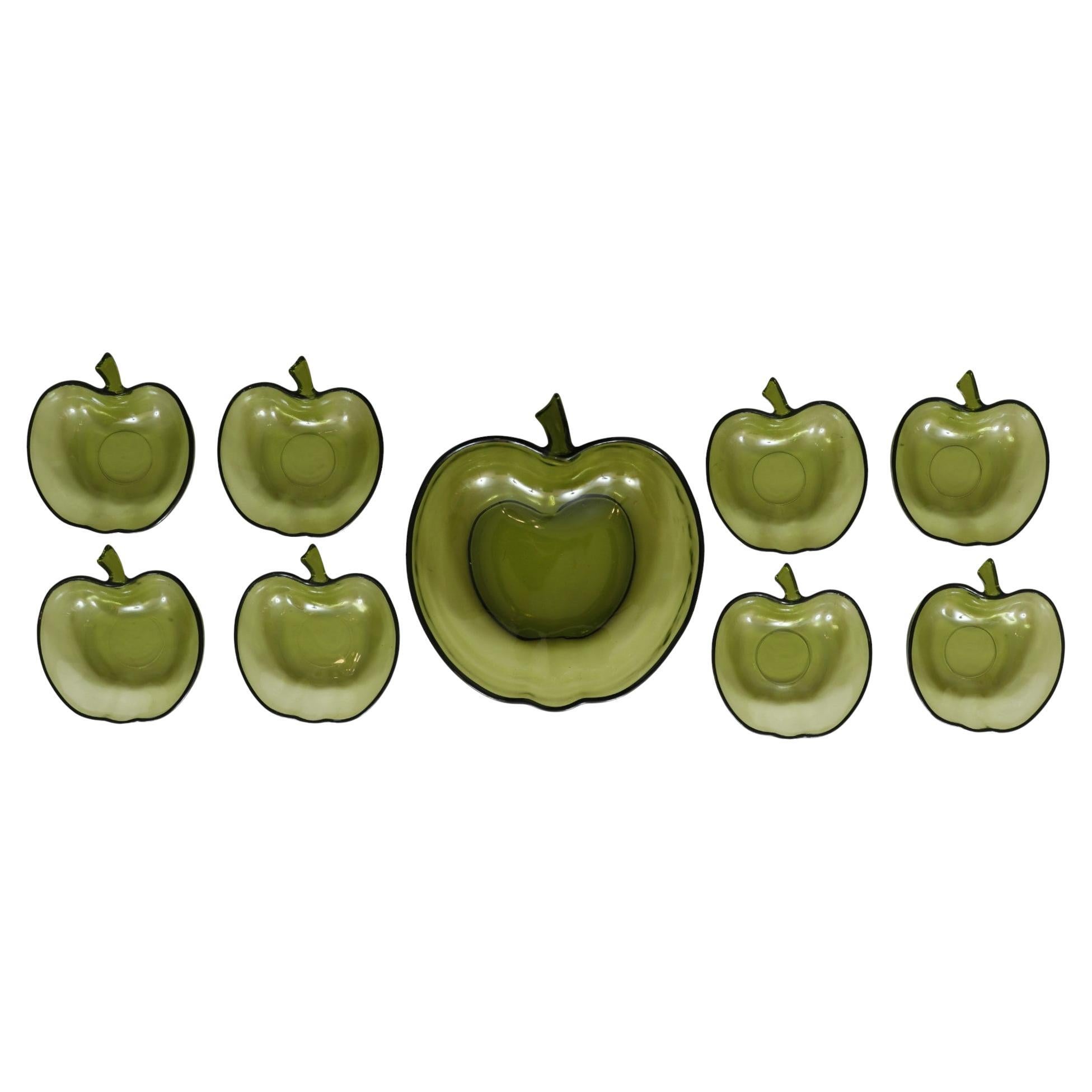 Un ensemble de neuf bols en verre vert des années 1960 fabriqués par Hazel-Atlas Glass. Huit petits bols et un grand bol sont moulés en forme de pommes. Le grand bol mesure 10,25 "L ...