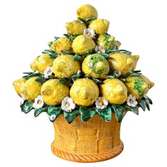Un vase figuratif de taille moyenne en terre cuite conçu comme une tête avec des détails de surface texturés et naturels et des reliefs de cerises colorés accentuant son expression l...