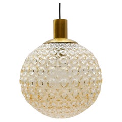Un superbe luminaire à disque rond en laiton massif poli des années 1960, avec 16 orbes en verre massif. Sources de cinq lumières qui émettent de la lumière vers le bas à travers le ...
