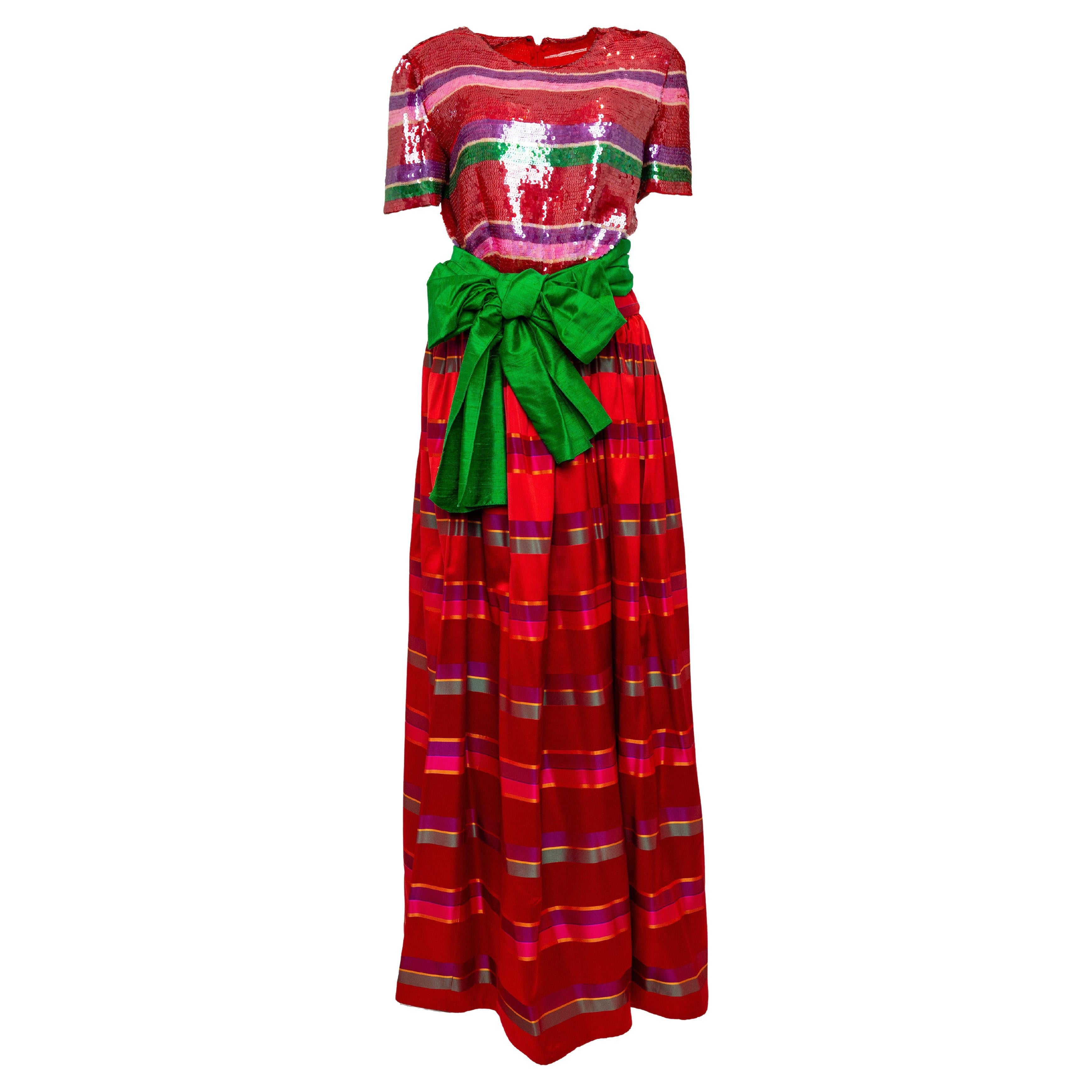 Vintage Victor Costa Jupe rayée rouge avec top rayé à paillettes et ceinture verte