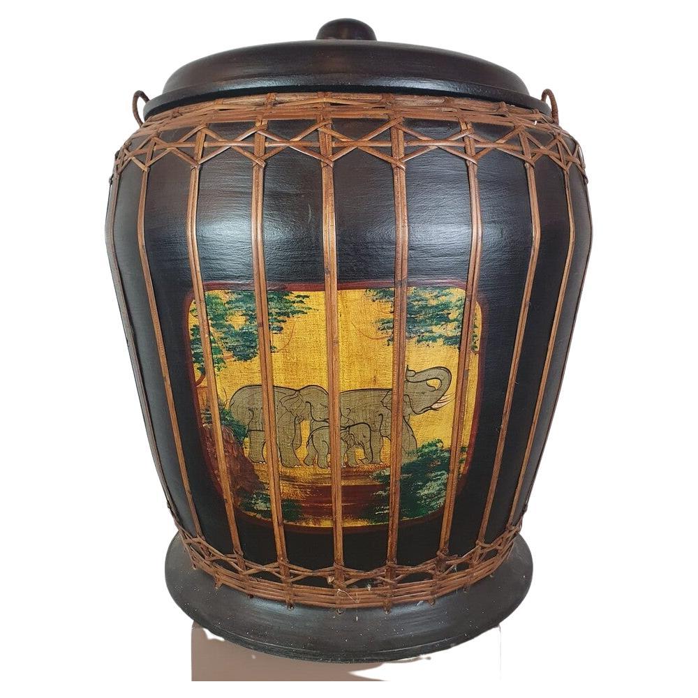 Eventail décoratif vintage en bambou tressé à la main et bois peint Accent mural