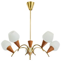 Lustre scandinave du milieu du siècle, produit par un fabricant suédois non identifié dans les années 1950. Fabriquée en laiton, elle comporte cinq bras décoratifs qui s'étendent à p...