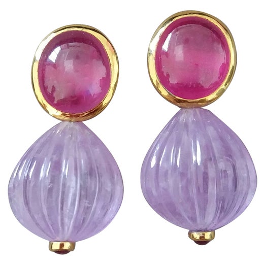 Ces boucles d'oreilles simples mais élégantes, faites à la main, sont composées de 2 ovales. Cabines en saphir bleu mesurant 8 x 10 mm serties dans un chaton en or jaune 14 Kt. au ...