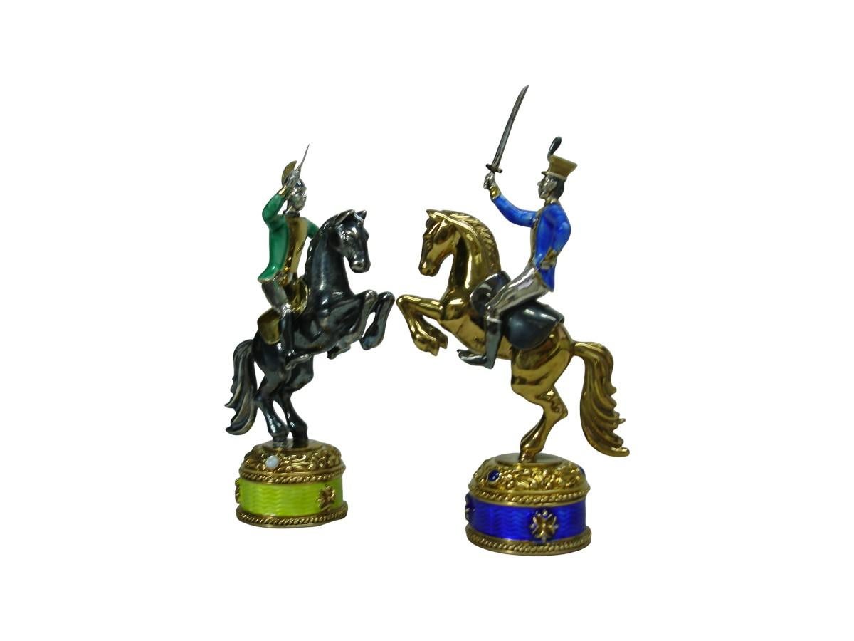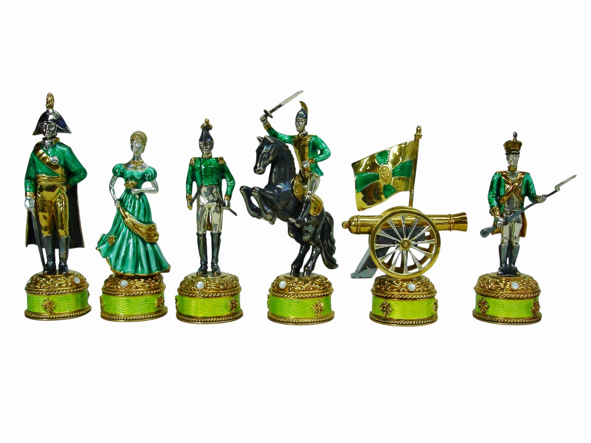 Cet extraordinaire jeu d'échecs sculptural donne vie à l'affrontement historique entre Napoléon et Alexander I+I au cours de la guerre cruciale de 1812. Chaque élément, des portraits impériaux aux motifs architecturaux, a été élaboré avec une précision historique et un raffinement artistique méticuleux, en s'inspirant des traditions et des techniques décoratives légendaires de la maison Fabergé.