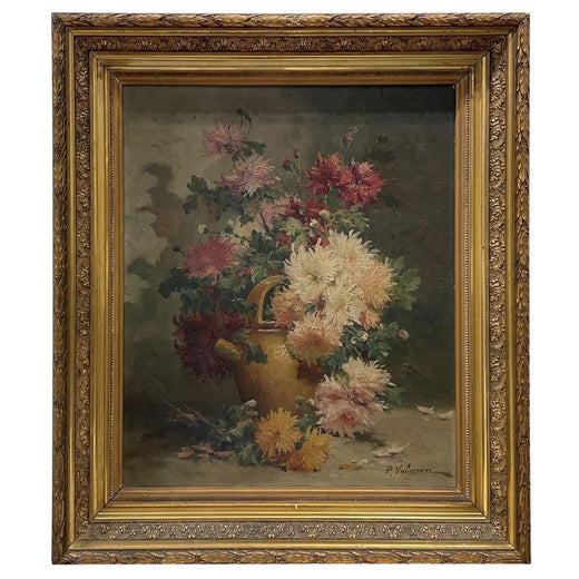 Nature morte ancienne française, rose et blanche, huile sur toile représentant une table de travail avec un vase théière jaune avec des fleurs, peinte par Eugène Henri HENRY dans un cadre d'origine en stuc doré sculpté à la main, particularisé par des feuilles, en bon état. La peinture colorée représente une composition florale, un bouquet de chrysanthèmes. L'œuvre d'art représente le mouvement artistique de l'impressionnisme du 19e siècle. Signé du pseudonyme P. Valmon en bas à droite. Le cadre présente une légère décoloration due à l'âge. Usure conforme à l'âge et à l'utilisation. Circa 1880 - 1890, France.