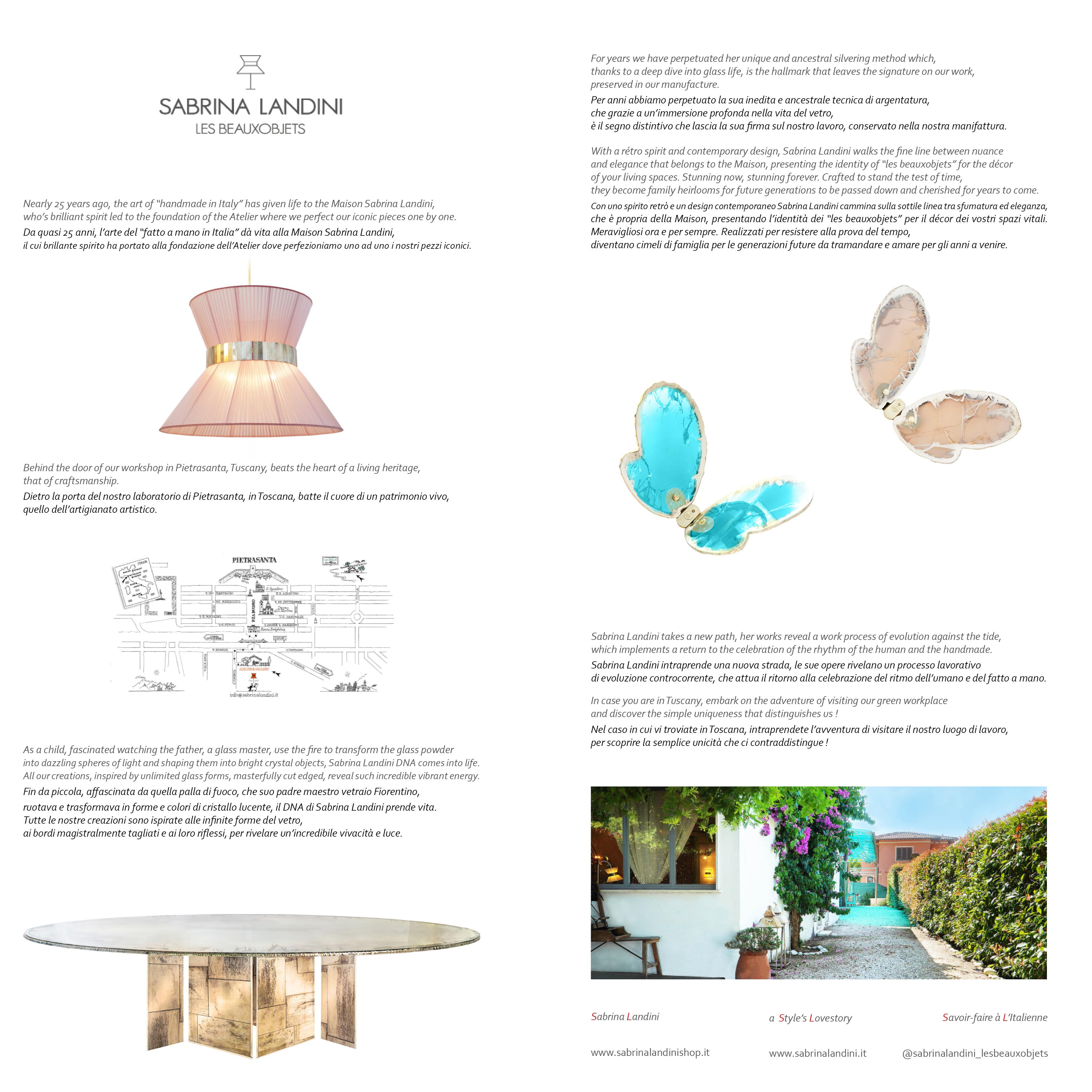 À l'âge adulte, Landini s'installe à Milan, en Italie, et ouvre un modeste Studio dans le quartier des Navigli. C'est dans cet atelier de Navigli que Landini crée son premier meuble de maison, un luminaire qui sera la pièce inaugurale de sa ligne Tiffany. Surmontées d'abat-jour en forme de sablier fabriqués à la main en organza de soie ou en tissus fins tels que le satin - et rassemblées au centre par une ceinture caractéristique en verre argenté - les lampes Tiffany à tige en laiton vieilli sont la marque de fabrique de Landini, celle dont elle est la plus fière. Alors que la série Tiffany s'inspire du film de Hepburn, ses suspensions Butterfly et ses lampadaires Sunshine présentent des motifs du monde naturel et comprennent des vitres en verre coloré, du papier japonais fait à la main et Art Deco-inspiré de la quincaillerie.