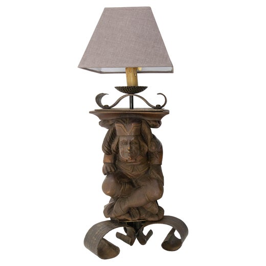 Cette lampe de table est une sculpture représentant un visage masculin et un visage féminin, sculptés dans le bois. Le bois a cette couleur brun clair du bois, avec la patine ancienn...