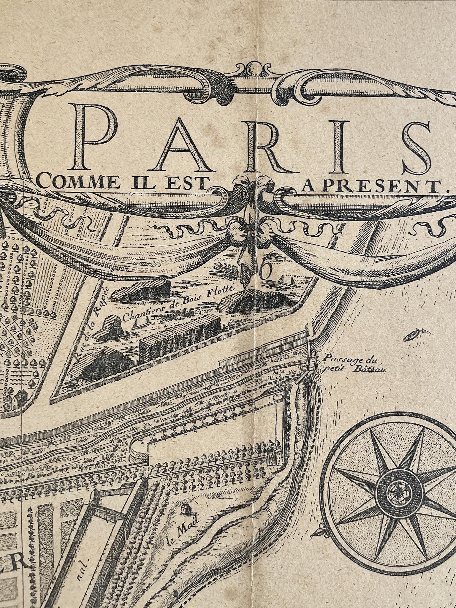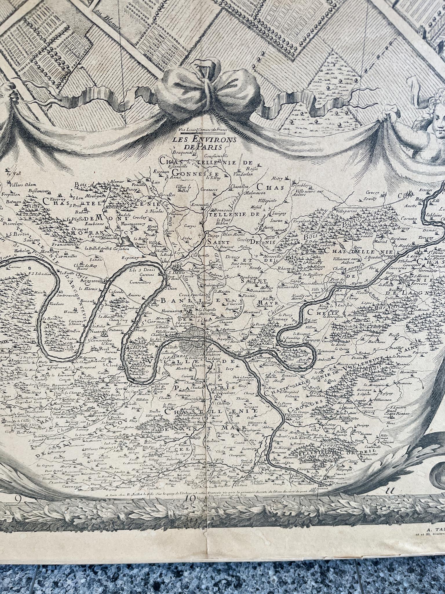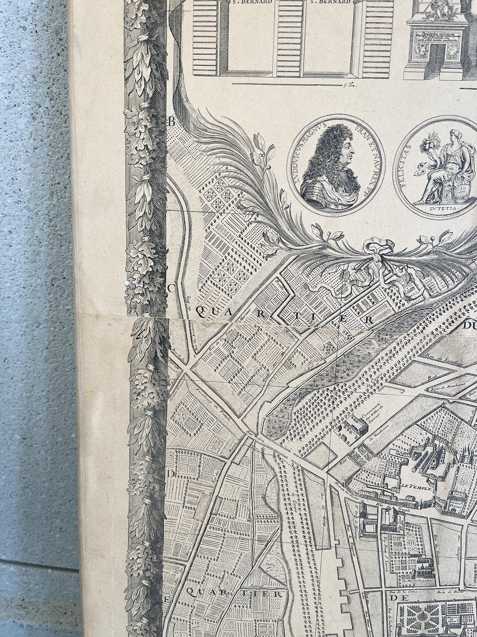 Imprimé au début du 20e siècle, cet ancien "Plan de Paris" est une recréation d'une carte antérieure datant de 1710, commandée à l'origine par Louis XIV. Il s'agissait d'une vue de la ville avec un rendu complexe. Cette récréation a été imprimée par A. Taride, dont le nom figure dans le coin inférieur droit. La carte a été montée sur lin avec un châssis en bois.