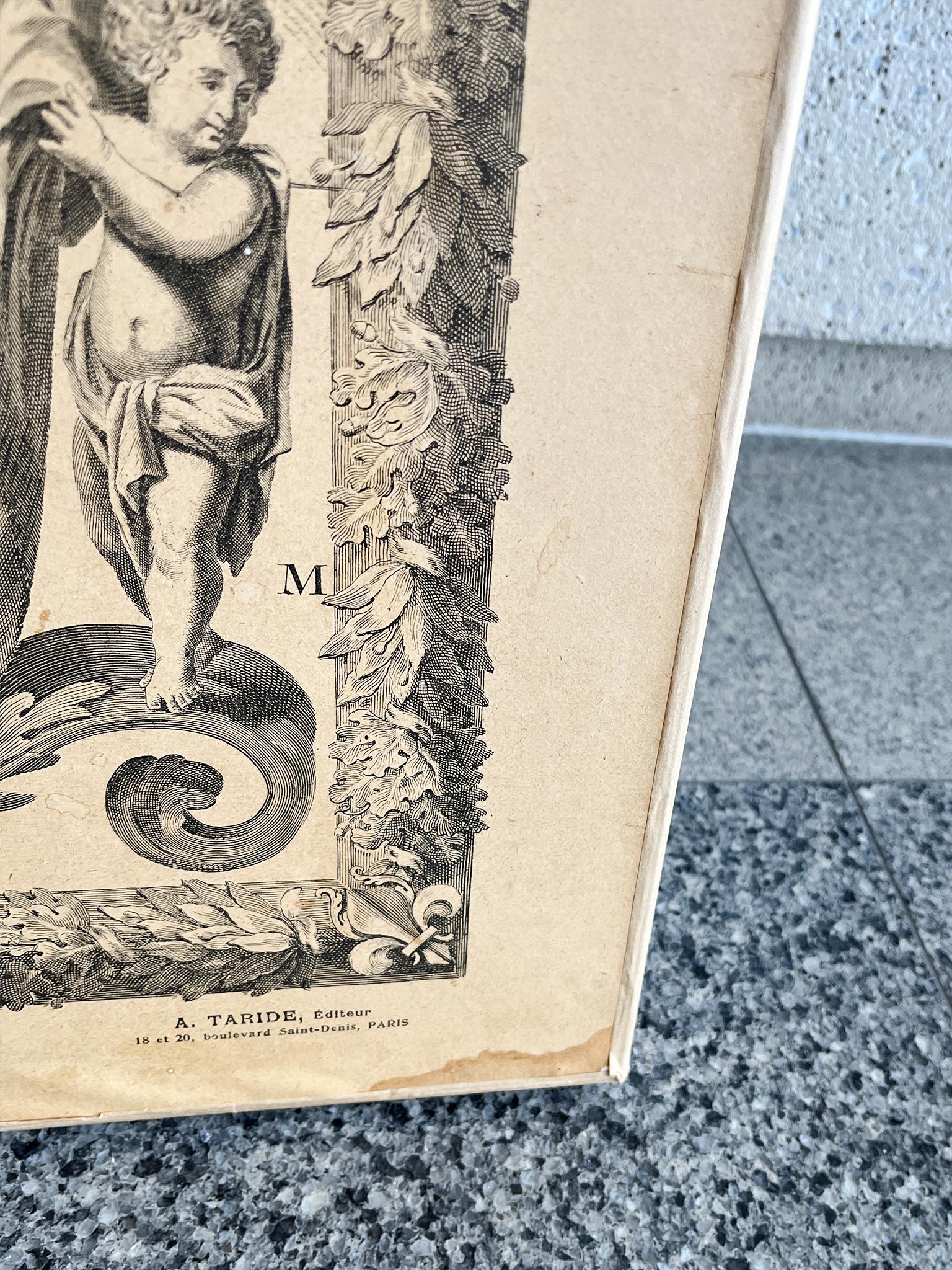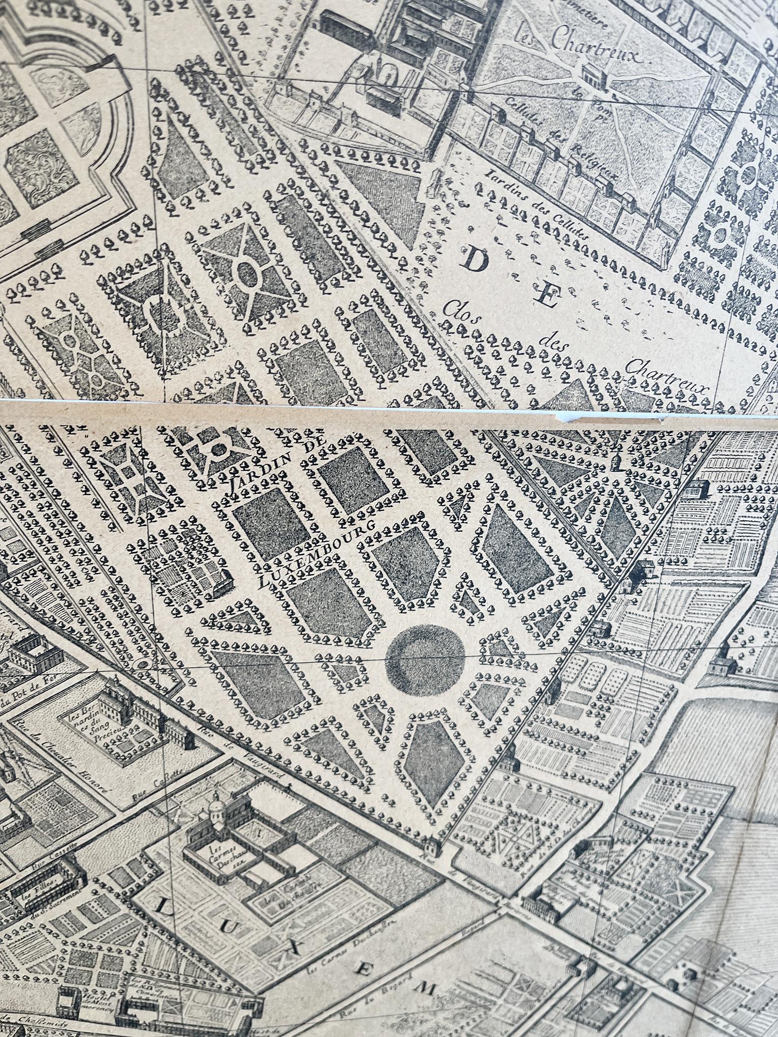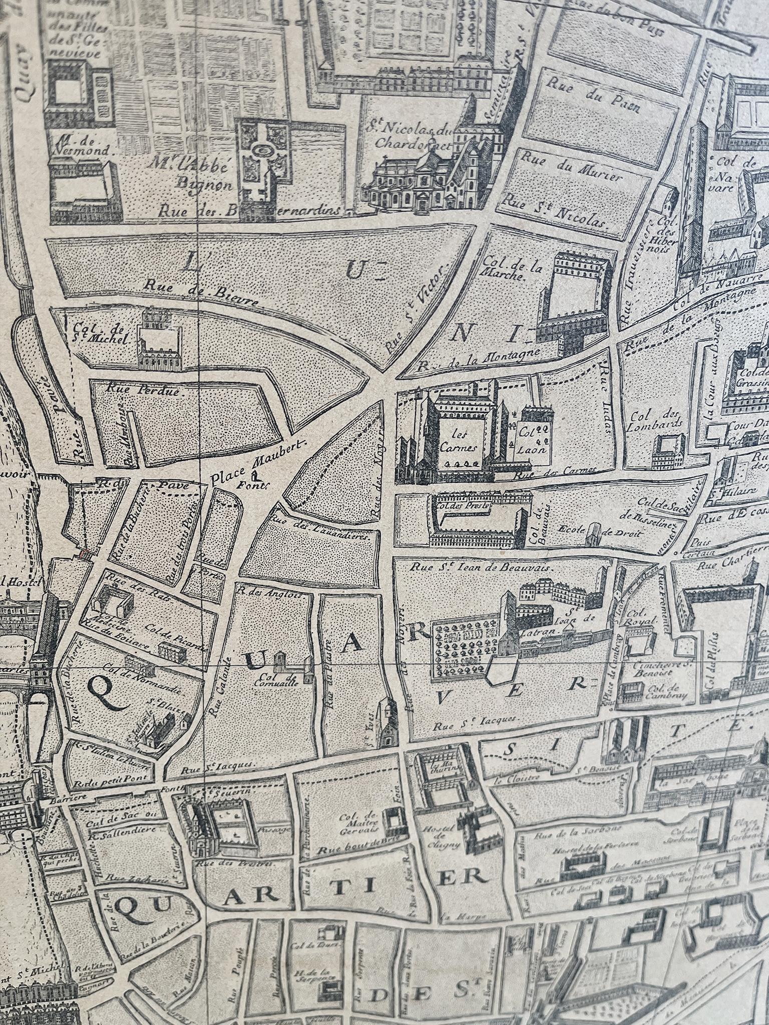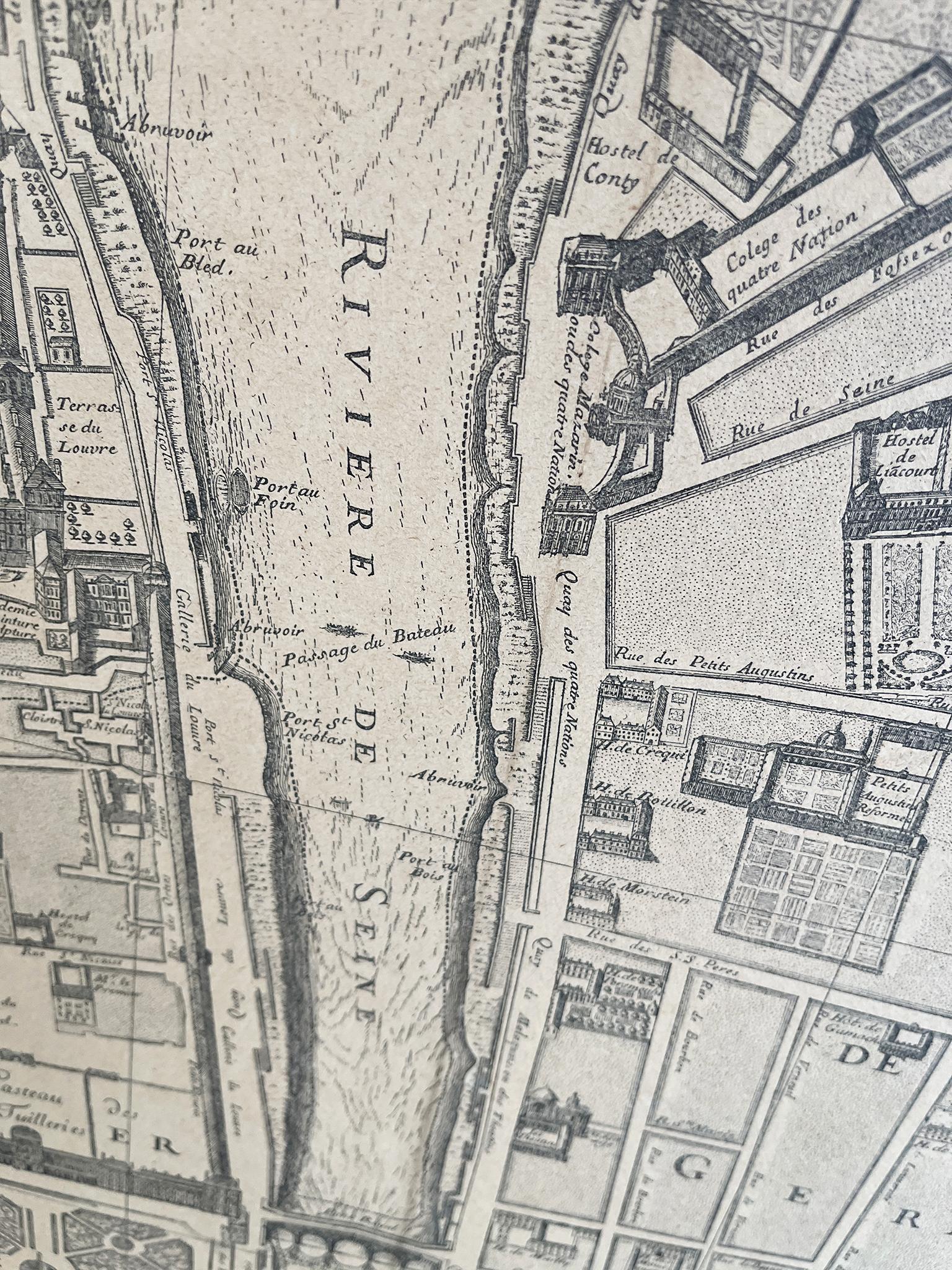 Imprimé au début du 20e siècle, cet ancien "Plan de Paris" est une recréation d'une carte antérieure datant de 1710, commandée à l'origine par Louis XIV. Il s'agissait d'une vue de la ville avec un rendu complexe. Cette récréation a été imprimée par A. Taride, dont le nom figure dans le coin inférieur droit. La carte a été montée sur lin avec un châssis en bois.