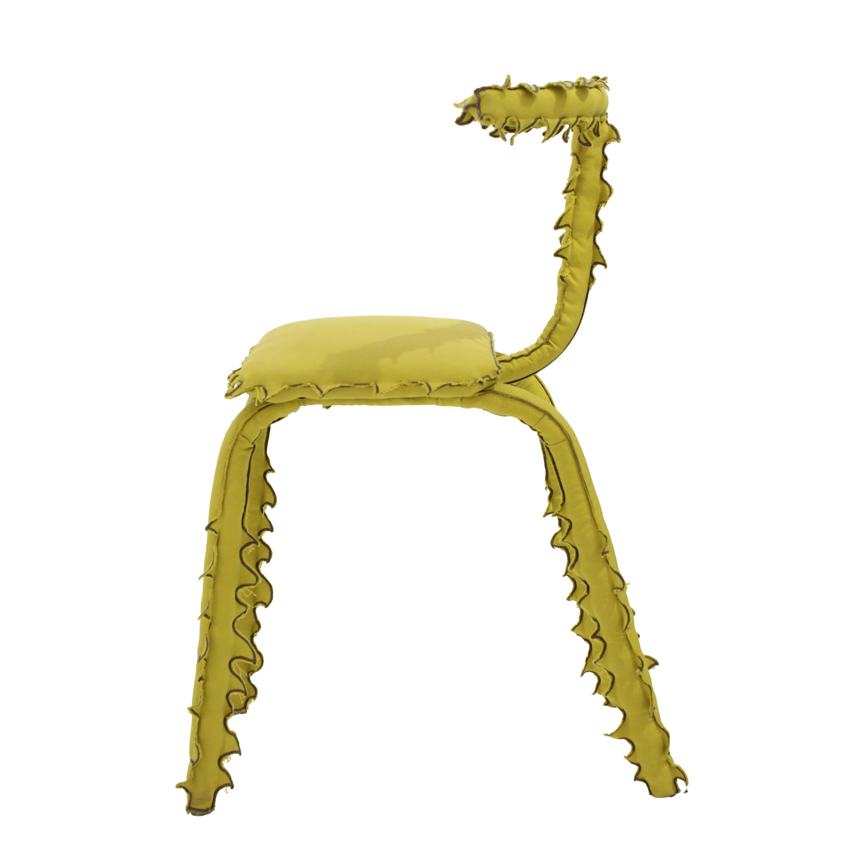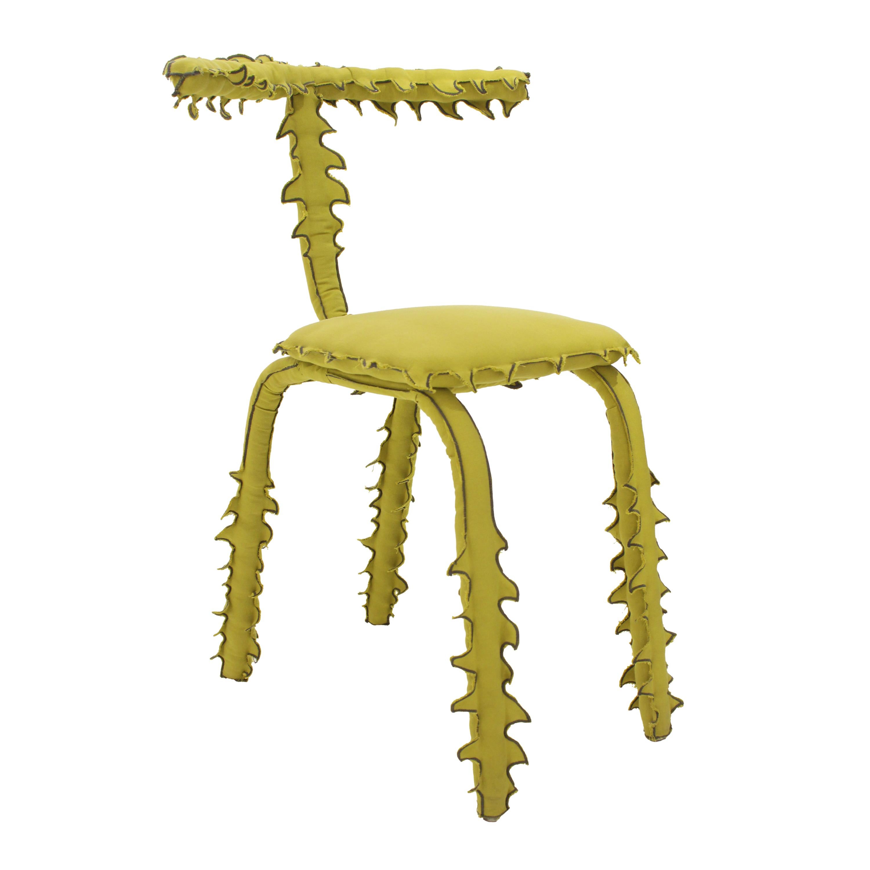 La structure interne de la chaise est construite à partir d'acier tubulaire incurvé, un squelette reconnaissable qui sert de fondement à l'objet. Cependant, sa véritable identité émerge de la couverture textile réalisée à la main, composée de formes pointues et organiques qui évoquent des processus morphogénétiques naturels, des variations subtiles au sein de la répétition qui génèrent des motifs vivants et dynamiques.