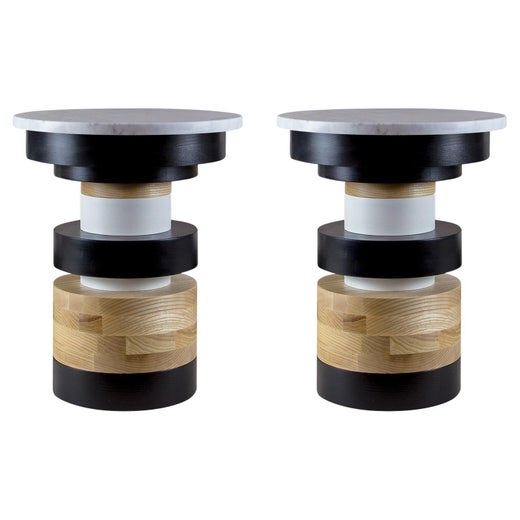 Les "tables Sass" inspirées par Sottsass sont des accents simples et sculpturaux pour tout espace intérieur. Fabriquées à partir de bases en bois empilées et d'un plateau en marbre a...