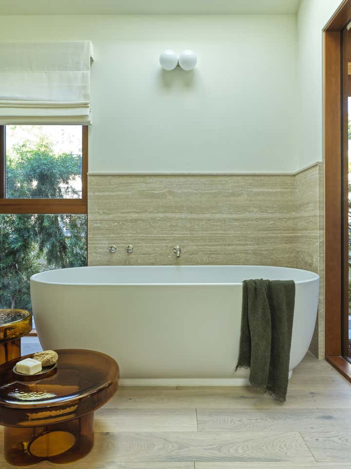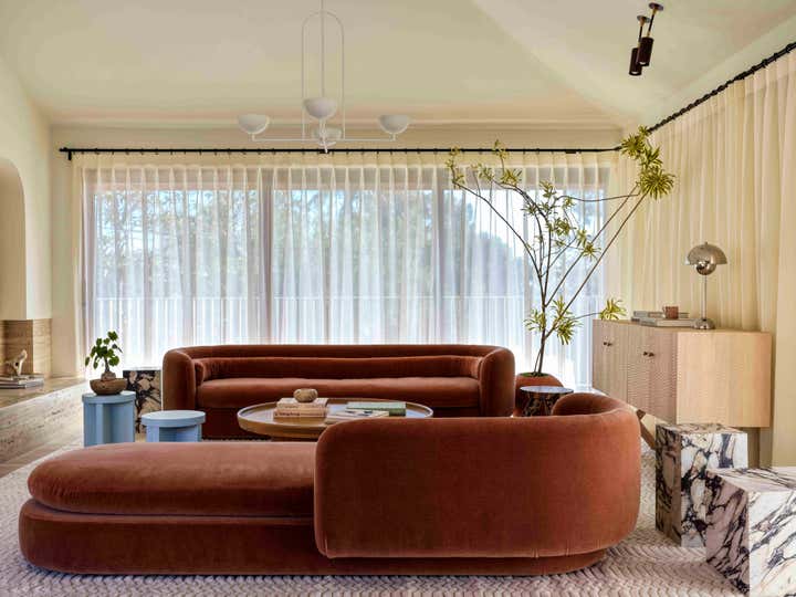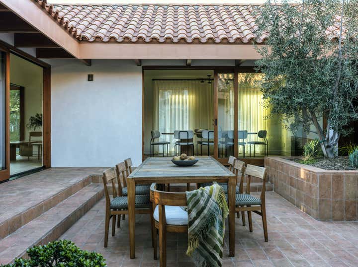 The layout of the house is very unique, in that it s subtle in how it functions, but it is essentially four small houses all attached together to form a courtyard with interior gardens cut out of the house. The idea is that one flows around the courtyard throughout the day from one space to another. From there, Ritz and Rabin chose a unique roof element as a defining feature to provide drama in the interiors and shade on the exterior. One of Ritz and Rabin’s favorite rooms in the home is the kitchen, with a specially designed 16 ft. travertine island and Explorer table by Jaime Hayon in the Breakfast Nook. From there, you’re brought into the beautiful living room that features a Group sofa from SCP in Mohair Supreme by Maharam and Zanat touch sideboard in the living room by Ilsa Crawford. Another favorite room of the house is the beautifully designed dining room that includes a Gubi Epic Dining Table and Two pendant chandeliers by Anna Charlesworth.