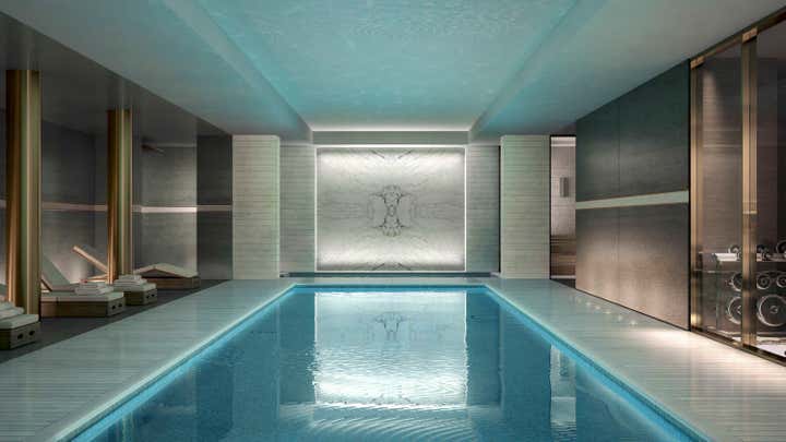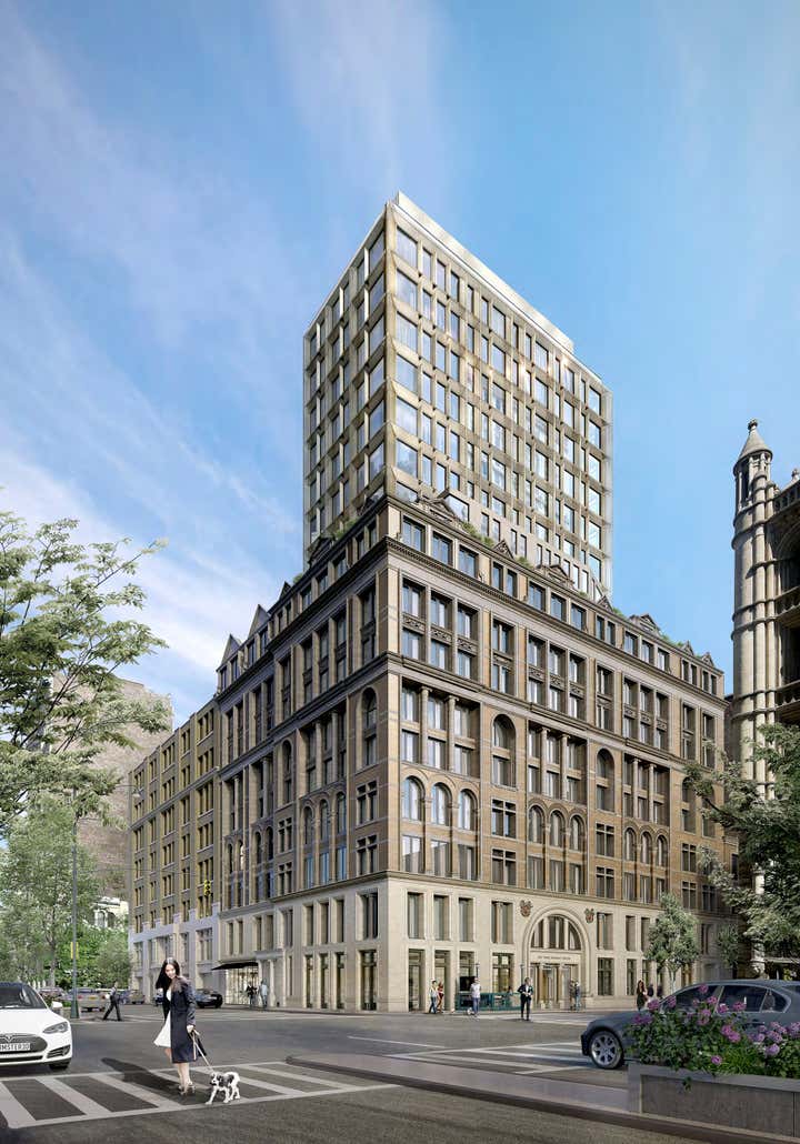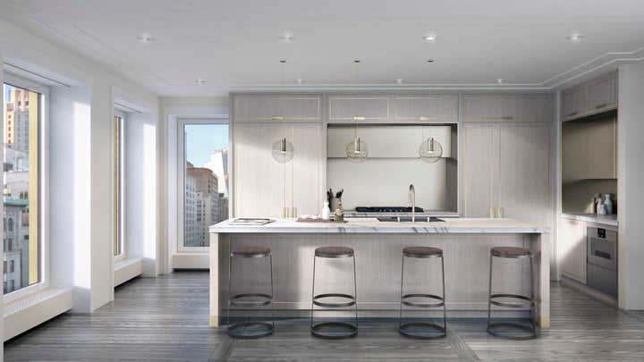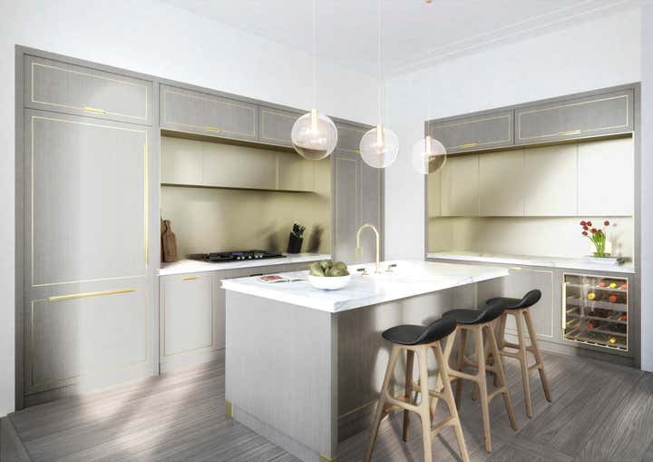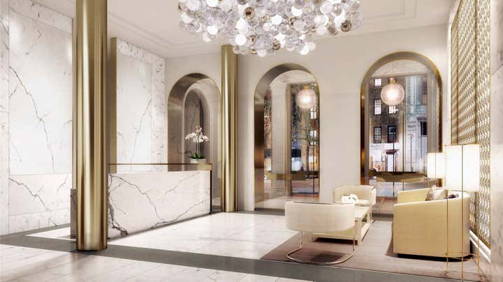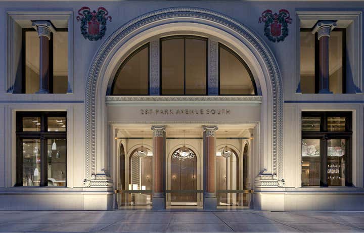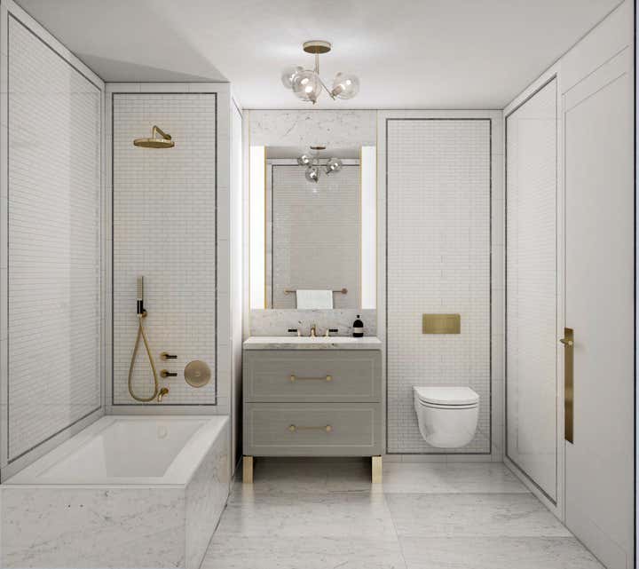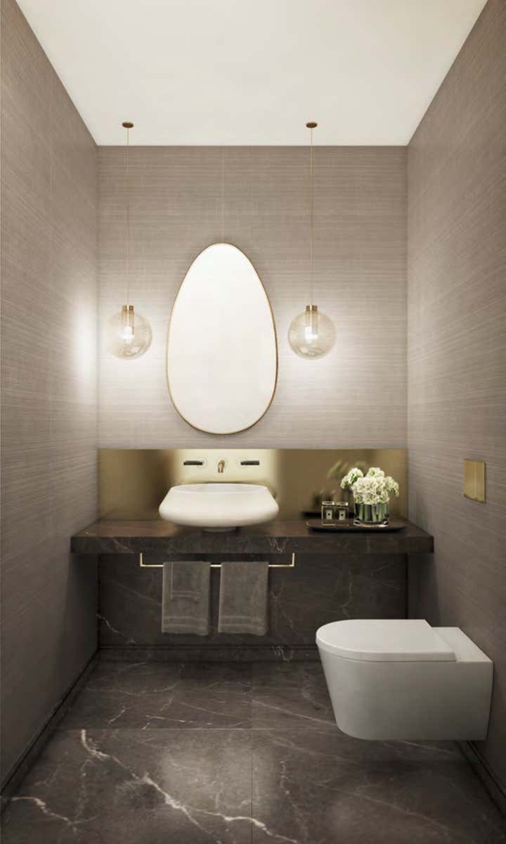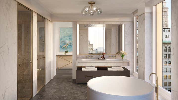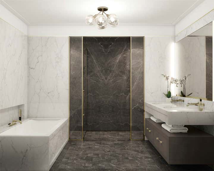 In the heart of the trendy Flatiron district, an existing landmarked 19th century neoclassical building is crowned by a new innovative brass and glass tower. The overall design approach of these two structures fuses the craftsmanship of a bygone era with sophisticated modern detailing and a subtle use of luxurious materials. The striking lobby preserves lavish elements of the original structure, including the moldings, restored and newly highlighted in bronze. Dramatic, intricate bronze fretwork screens frame the space; recalling the original iron work and are offset by sumptuous marble, shimmering metallic columns and bespoke walnut paneling. Overhead, a dazzling chandelier of subtly hued glassine orbs by Groves Co. presides over the tableau. The amenities floors offer residents a multitude of luxuries in supremely elegant settings. The 50’ saltwater pool and adjacent whirlpool are accented by book-matched marble walls and augmented by a wet sauna, rain shower, and marble-clad private changing rooms. The grandly proportioned residences, ranging from two and three bedrooms to penthouses, astound with a sublime approach to pre-war detailing. There is a graciousness to the entire experience at 287 Park; repeated juxtapositions of hard against soft, light against dark, create a language of dichotomies carried throughout. Each unit features a marble foyer with wood paneling, wide plank European oak flooring, and opulent marble bathrooms. The kitchens are furnished with oak cabinets, metal accents of striking bronze and handcrafted hardware. Thick slab marble counters are finished with a custom edge, and state of the art appliances compliment the old-world-meets-modern scene. Throughout the building, Groves Co.’s custom sleek champagne brass plumbing fixtures and stunning new lighting collection are showcased.
