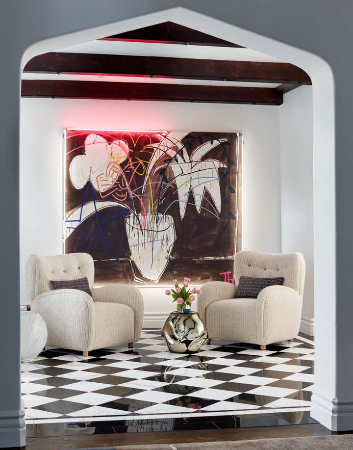 With classic interior details, like checkboard marble and parquet wood floors, roughhewn beams and extensive woodwork, and beautiful moldings throughout, the home needed to be updated to reflect the new owner’s creative lifestyle.