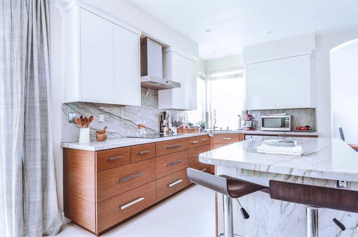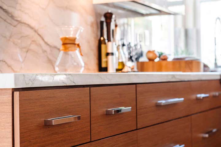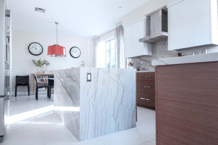 An old, outdated builder s grade home was completely upgraded to a family friendly home with high end finishes. The contemporary kitchen was remodeled using Brazilian quartz and Italian floor tiles with a textured linen finish. The cabinets were all replaced under the counters with deep drawers which provided much better storage for heavy pots, pans etc. and the stove was replaced with a Thermador induction which has a child-safety lock.