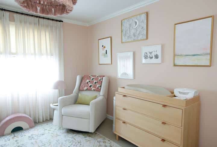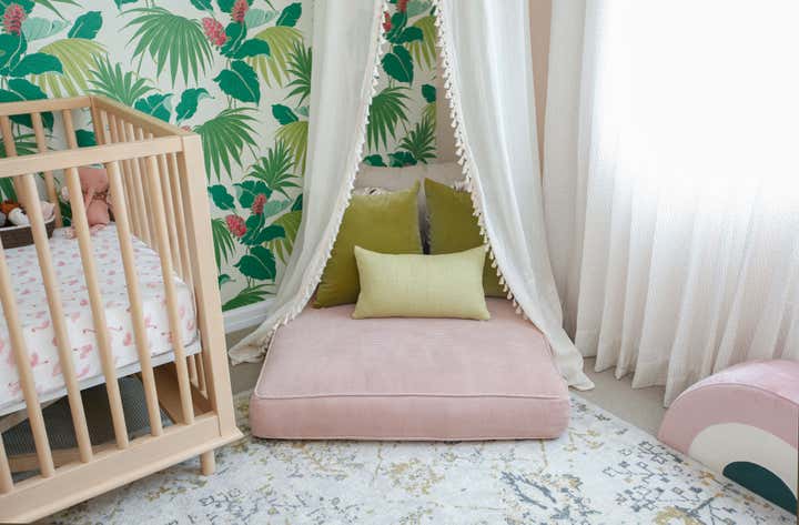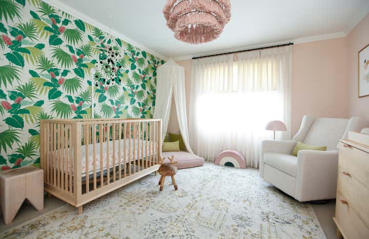 With a nod to old Hollywood we completed a darling nursery pulling inspiration from the Beverly Hills hotel and various tropical bungalows for a playful, sweet and sophisticated baby girl. We balanced elegant notes of a tropical wonderland with pastel colors and hints of bold contrast. The room features custom window treatments, a custom canopy corner and a gallery art wall along with light wood finishes and a statement flora wall.