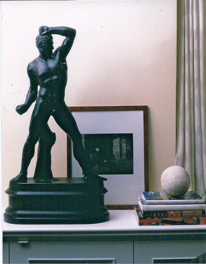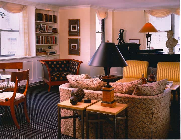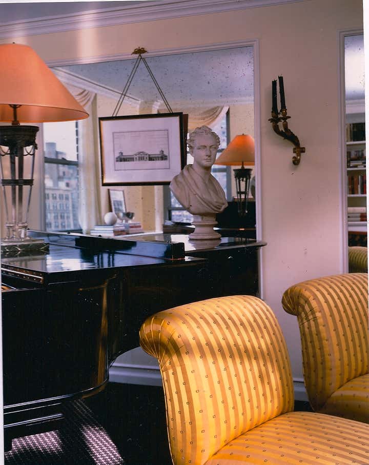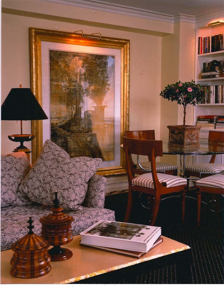 This was a standard white box apartment, but what made it special was the rare combination of its views: it overlooked Gramercy Park to the north, so it also had a spectacular view of the New York skyline. My client had lived there many years and when the adjacent apartment became available, he jumped on it. The architectural firm of William Green and Associates transformed the space, rearranging rooms and adding significant cabinetry and millwork to create a setting appropriate for 19th century art and antiques. My client’s existing pieces from the Biedermeier and Napoleon III periods were combined with plush upholstery in sumptuous fabrics. I also injected some appropriate modern pieces to enliven the overall look, creating the perfect retreat for a sophisticated New Yorker with impeccable taste.