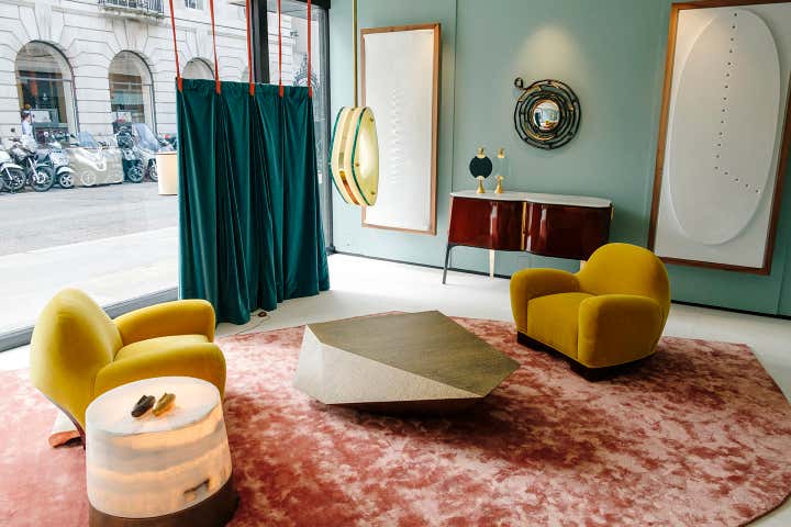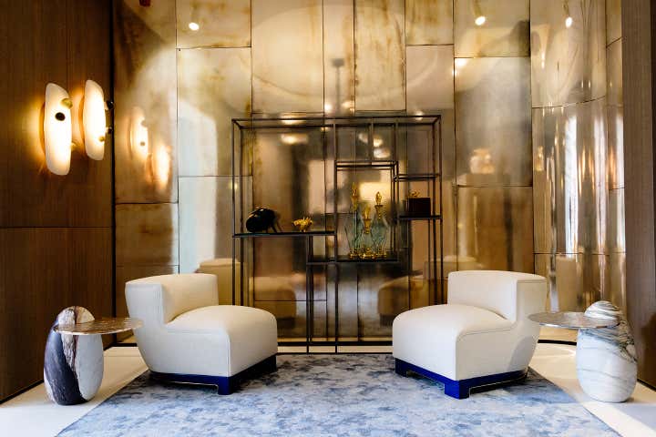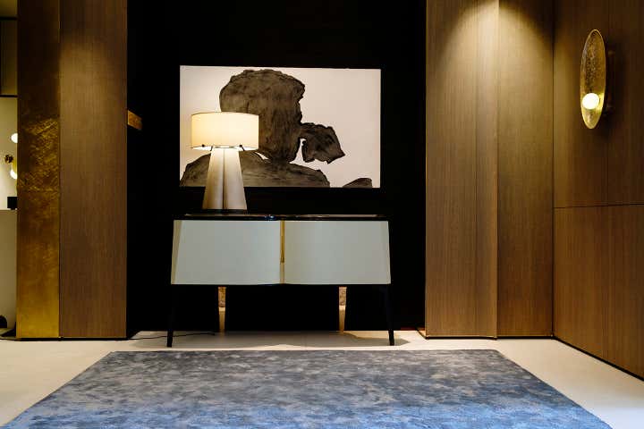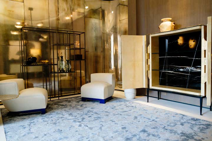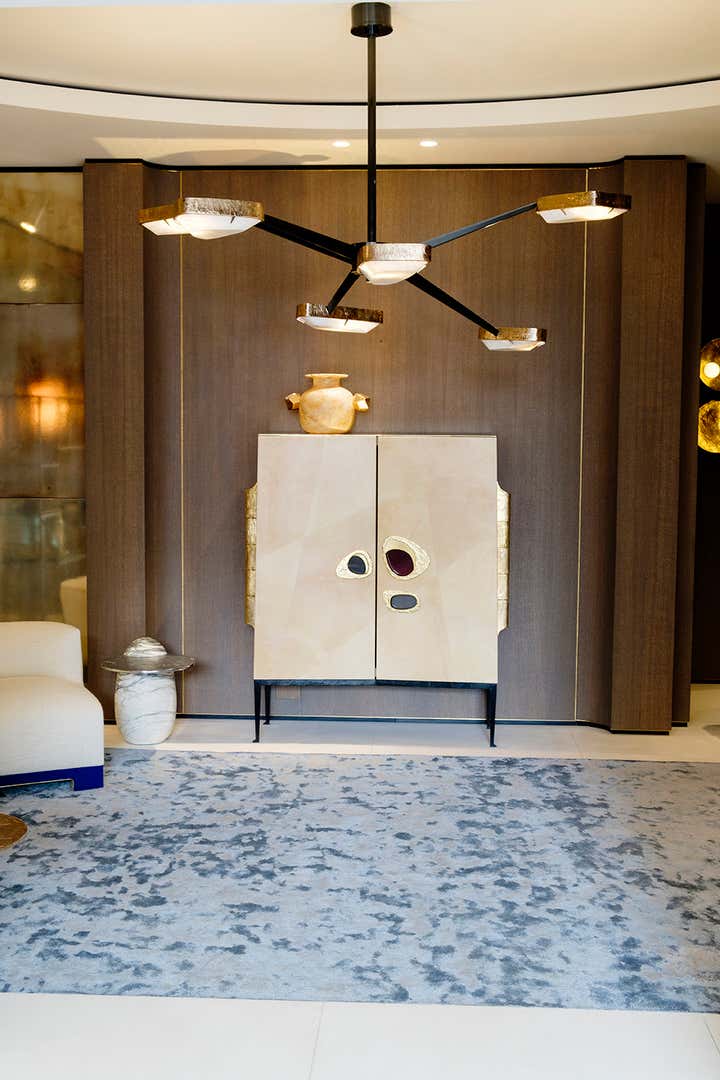 The front room of the Atelier features two new eye-catching armchairs, Tato, named after Guglielmo Sansoni Tato, a prolific artist of the Futurist movement and protagonist of aero-painting. The design of the chairs references Art Deco, whilst also revealing a nod to 1930s industrial design. The central multifaceted coffee table Pietra is a magnified version of Salvagni’s classic Emerald table but is here rendered in stained lacewood. In the same room a set of Angel sconces, a classic example of Salvagni’s popular onyx wall lights, are shown in London for the first time.