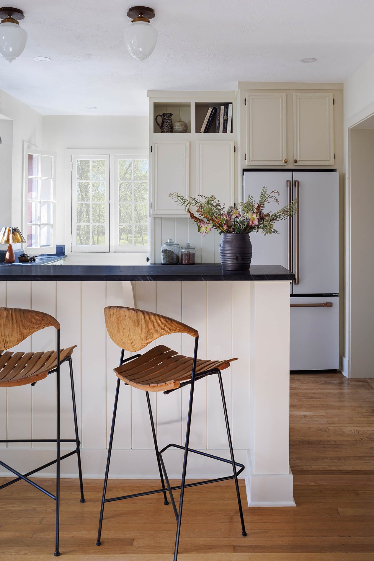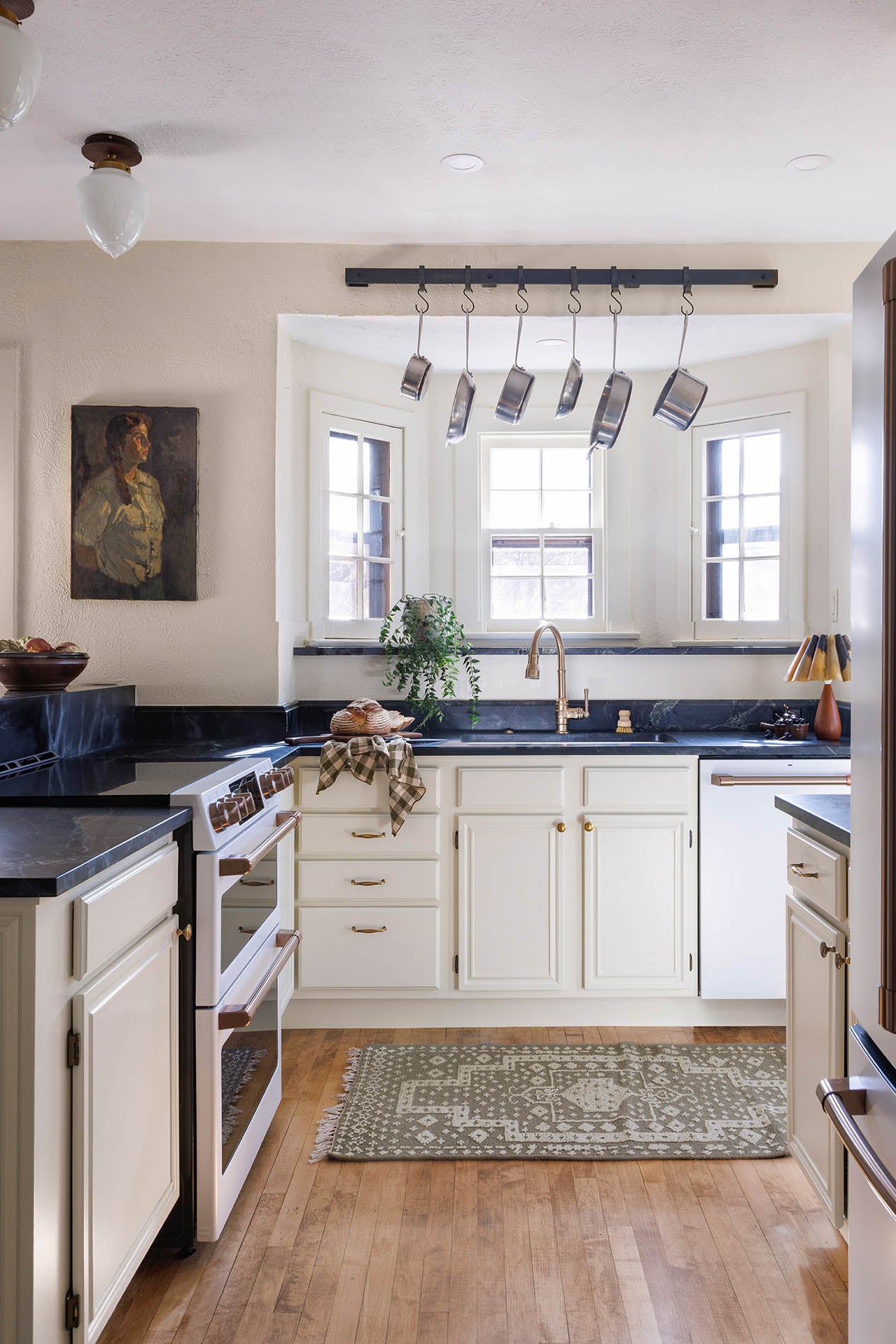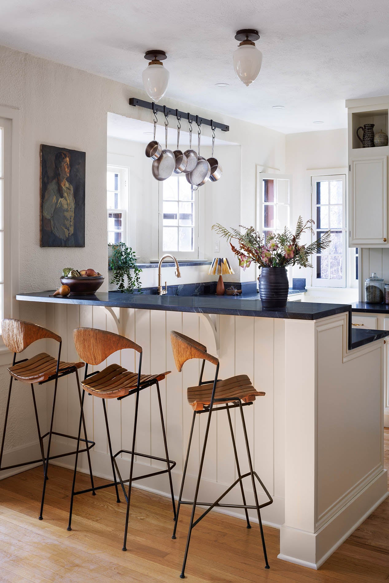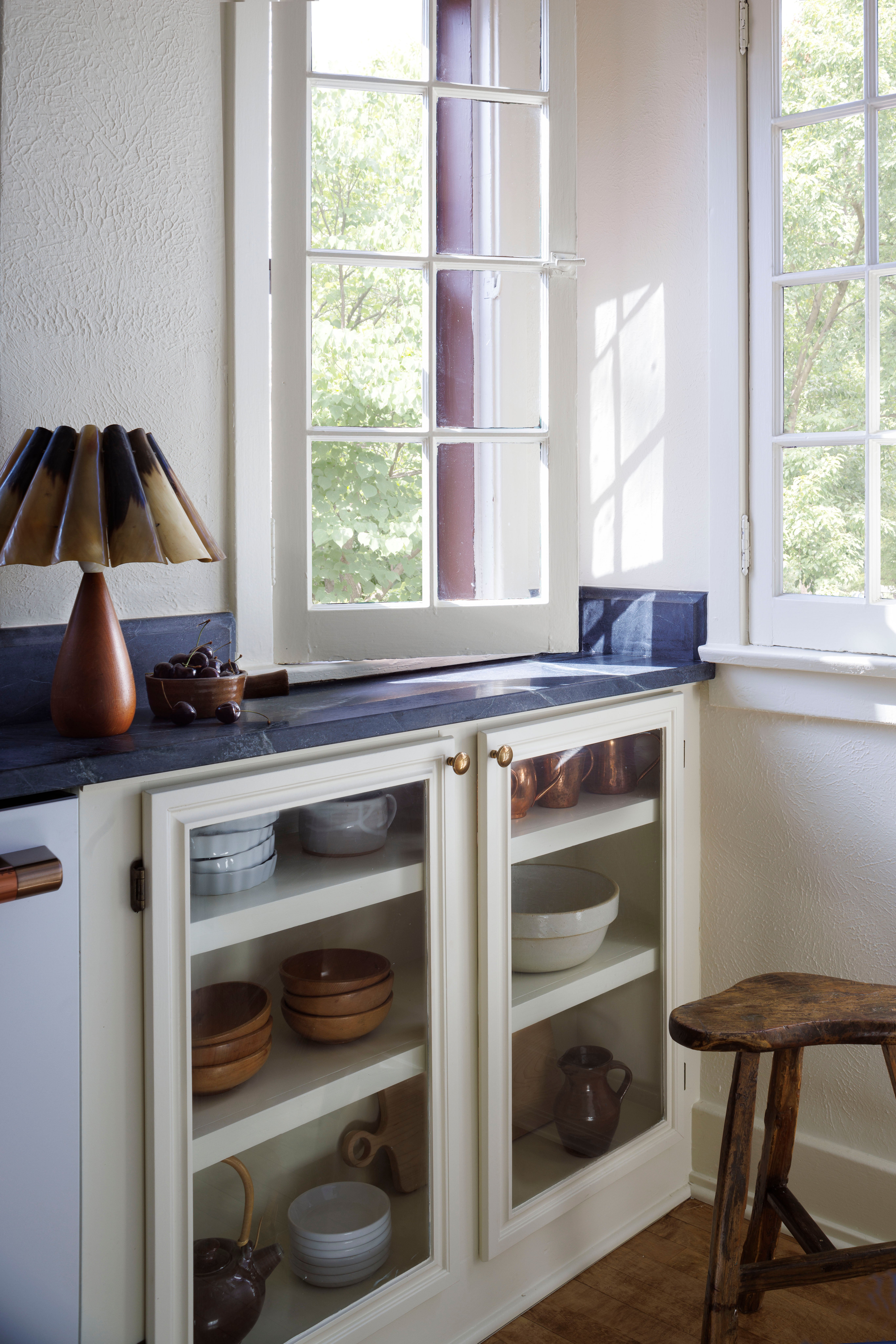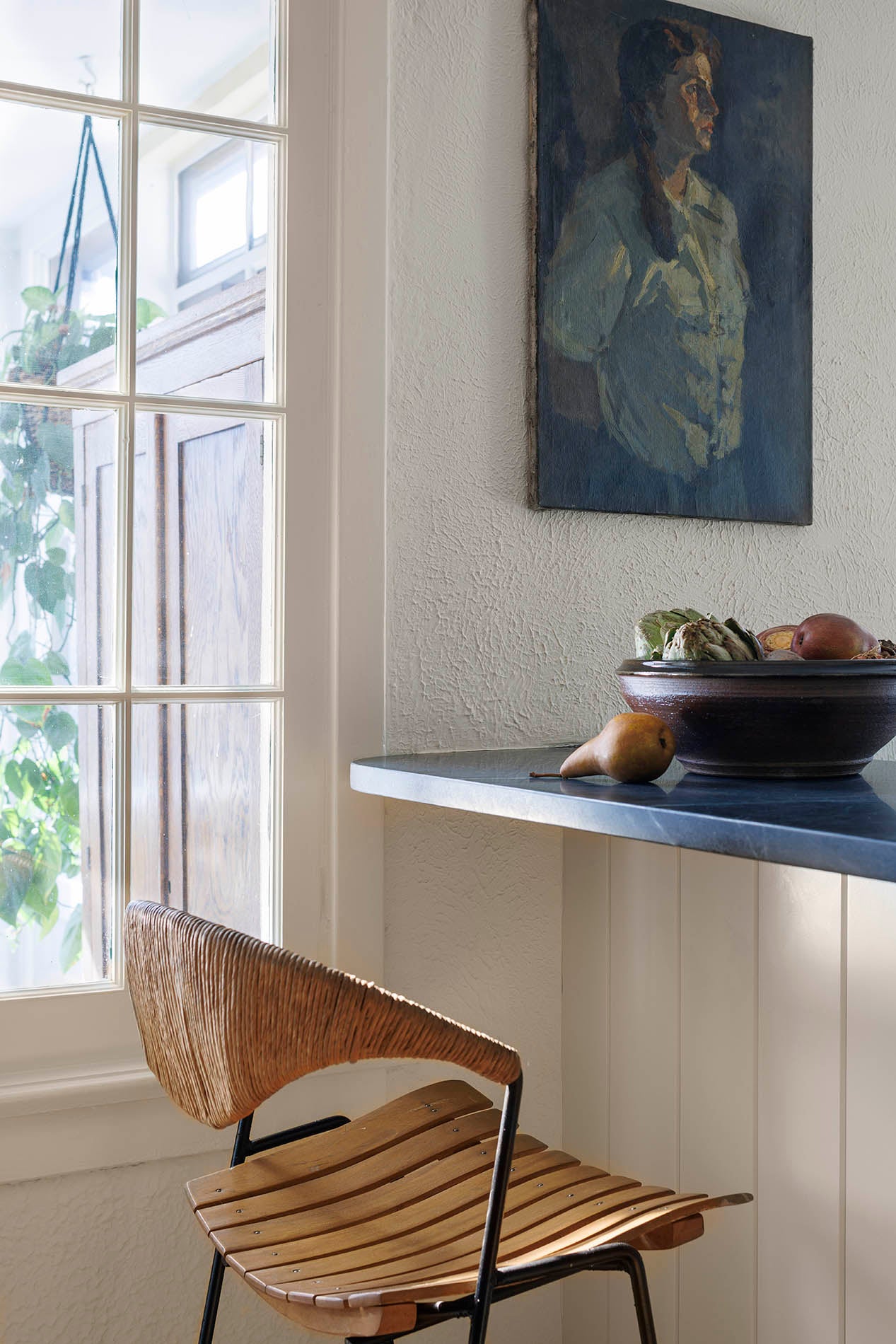 We made the smallest number of changes that had the largest impact. The existing cabinets remained, but received a new coat of paint and hand-crafted hardware from New York. Local soapstone countertops replaced the former tile, and subtle millwork details both created additional storage and called back to the original 1920s Spanish Revival style. We love the V-groove added throughout, which mimics the design of their original front door.