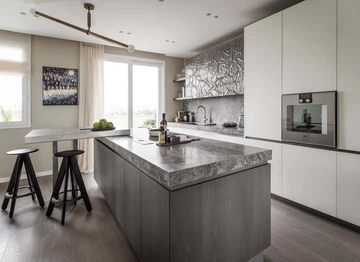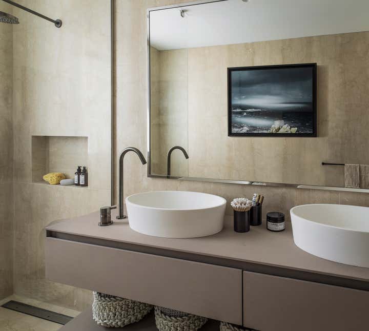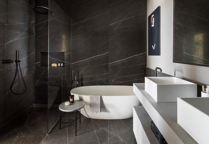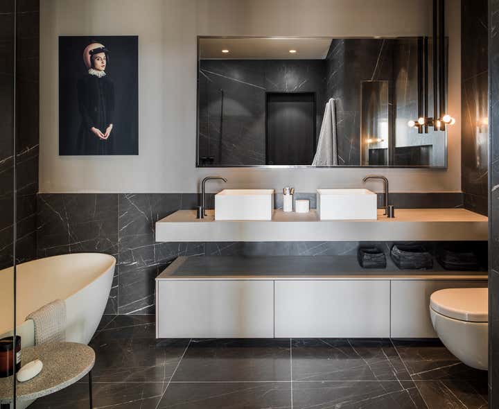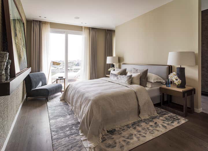 This apartment showcases tying the old with the new, blending modern Italian form with Fiona’s take on elegant brutalism, and is fully immersed with the heritage of the Monticello site. The apartment was curated with a mixture of custom-made bespoke furniture, exquisite lighting and accessories to make the space feel entirely unique. A combination of timbers, metals, leathers and velvets and marble have been used to add depth and texture to the design, which is timeless and beautiful. There is a playful edge to this apartment displayed flawlessly; the pops of vivid colour throughout, the anthropomorphic form of the finishes and textures and the curation of brave artworks positioned throughout to create a striking juxtaposition to the calming interiors. Subtle nods to the surrounding Roman architecture and style with a modern twist that retain the elegance and stature of Roman design fills this apartment. The large open plan living, dining and kitchen area draws you in with a bright, airy palette creating a serene oasis ideal for relaxing and enjoying the beautiful views of Rome with wall to wall windows framed beautifully with delicate sheer curtains. The living room rug takes inspiration from the ancient mosaics that have been unearthed in old villas around the city and the stature of the dining table’s strong cylindrical legs pay tribute to the famed Roman columns, with an oversized beading detail that reflects that strength and elegance of Roman life. The bedrooms have a restful ambience created through the layering of soft textures and soothing tones with the Master Bedroom dressing room being a testament to understated luxury and attention to detail. The statement bathrooms have used striking Italian marbles to generate a feeling of indulgence with a modern twist that retains the elegance of Rome with its mix of muted tones and rich bronze metals. This apartment evokes a sense of warmth and homeliness whilst being surrounded by the best of Rome’s views.